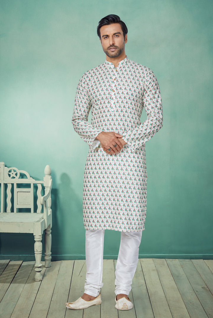 Refresh your festive wardrobe with this elegant Ivory Kurta, detailed with an all-over traditional paisley and floral print in vibrant hues of pink and green. Paired with a white Dupion Silk Pyjama, this set strikes the perfect balance between classic sophistication and contemporary charm.