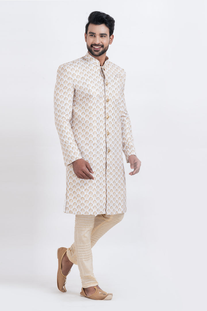 Design Features: Bandhgala Collar, Golden Buttons, All-over Floral Pattern, Pocket Square Style