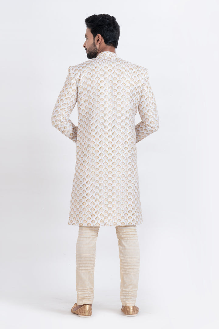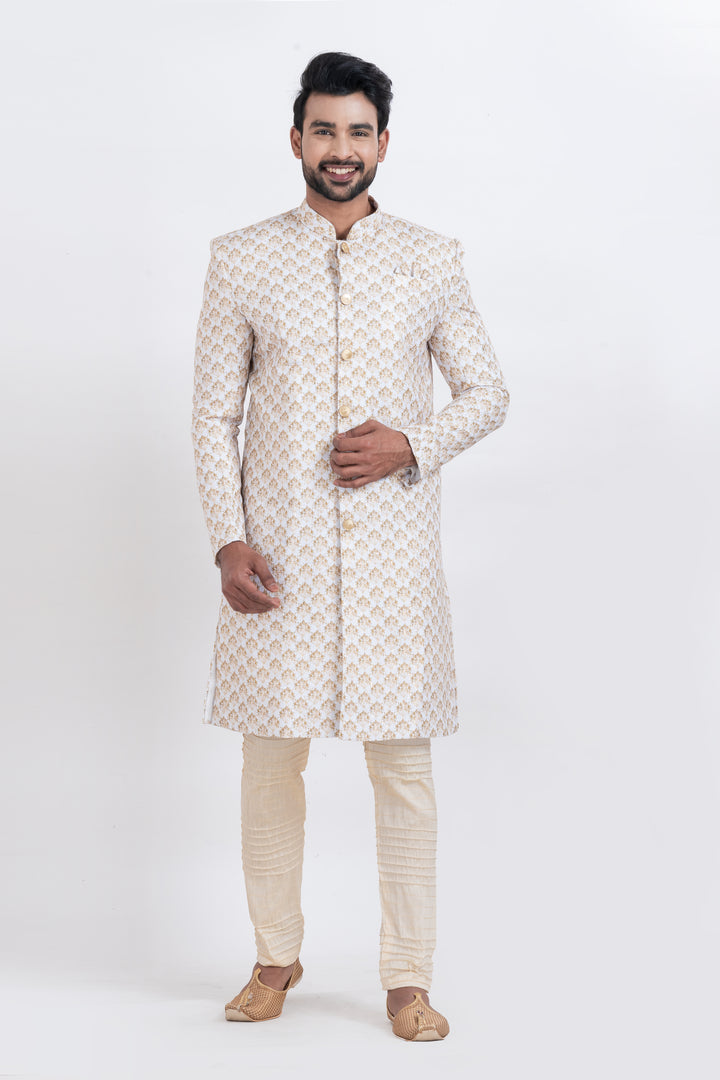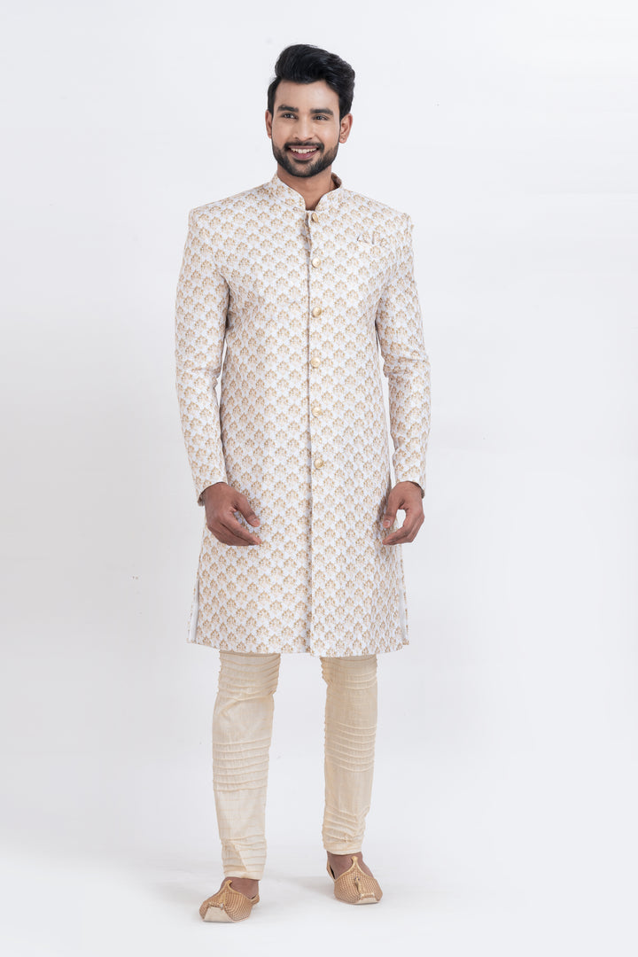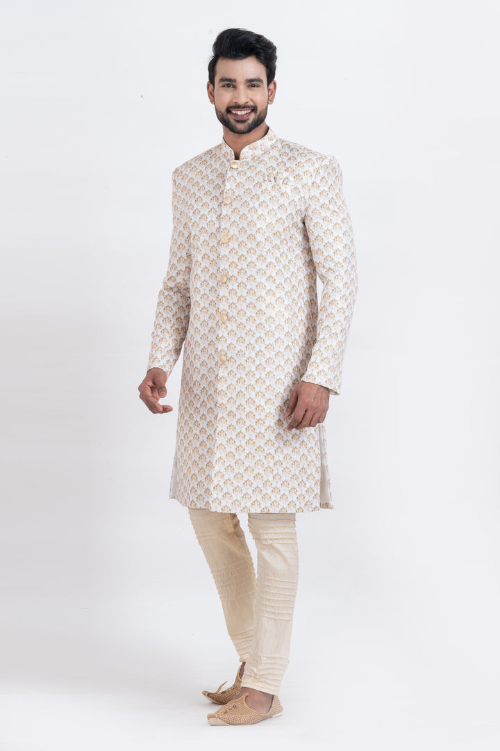 Radiate sophistication and poise with the Ivory Regal Bloom Indo Western Set, a timeless expression of traditional grandeur. Featuring a finely crafted white brocade fabric adorned with intricate golden floral motifs, this set is a symbol of elegance. The mandarin collar, clean button placket, and sleek structure add to its stately silhouette. Paired with a soft cream churidar, it’s perfect for day ceremonies and wedding rituals.
