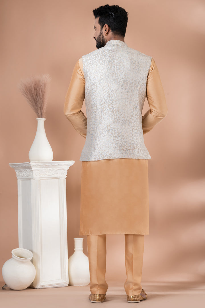 Step into refined elegance with this stunning Ivory Sequin-Embroidered Waistcoat, beautifully paired with a classic Beige Kurta Pyjama set. The kurta and pyjama, made from a soft art silk blend, offer unmatched comfort and a smooth, lustrous finish. The waistcoat stands out with its delicate sequin work, adding a subtle shimmer that catches the light with every movement—perfect for day-to-night festive wear.