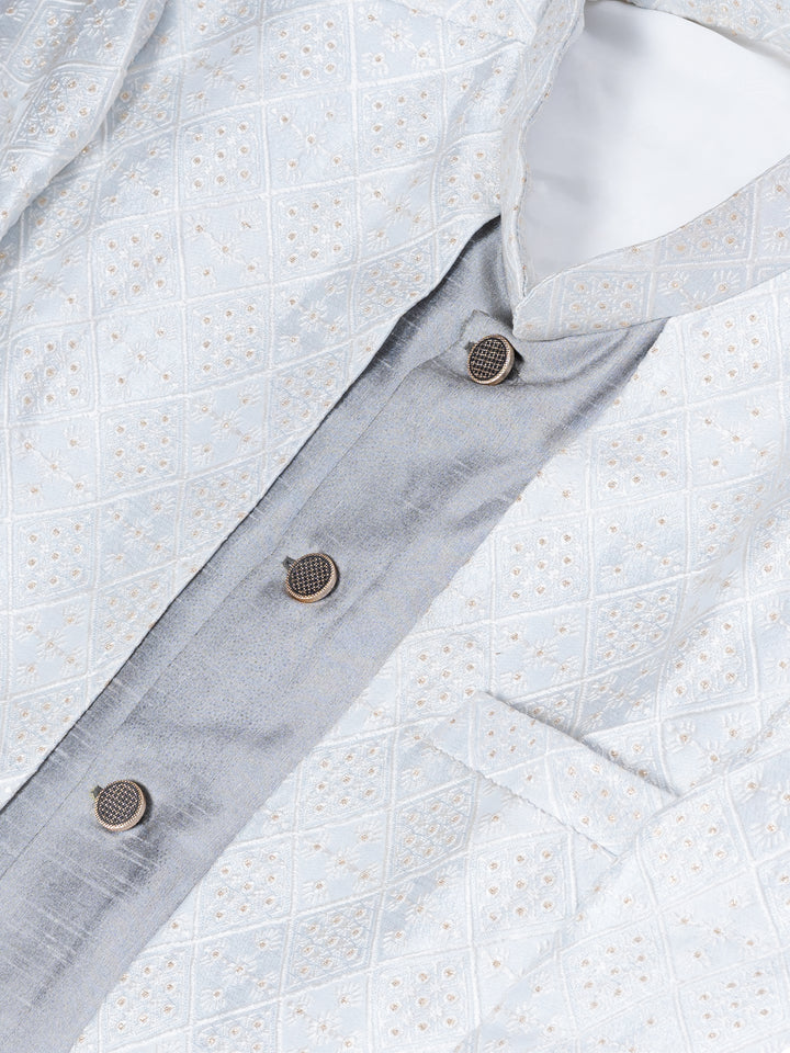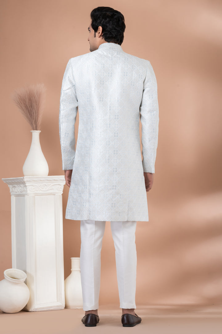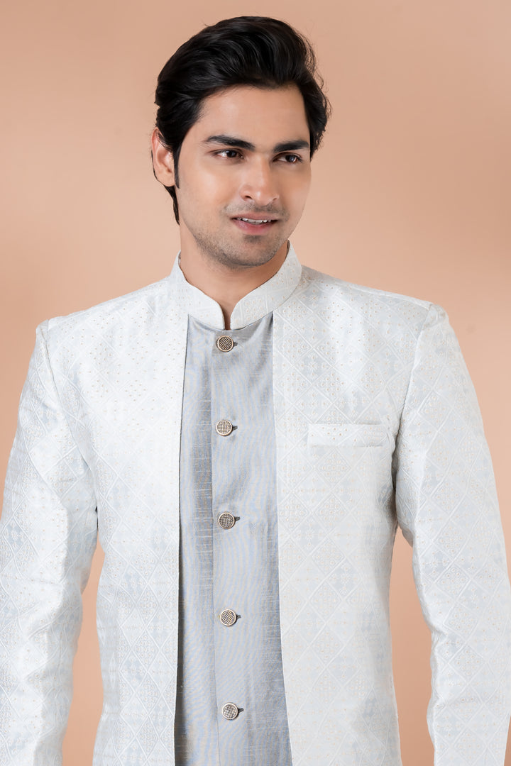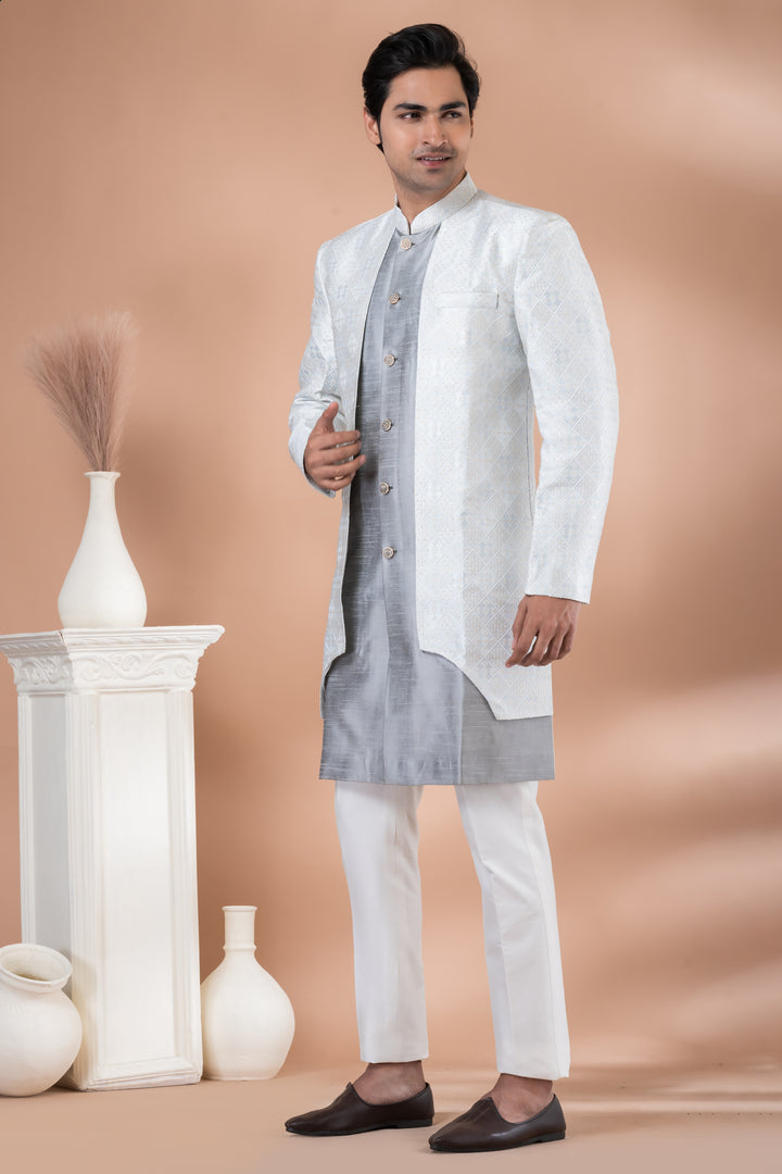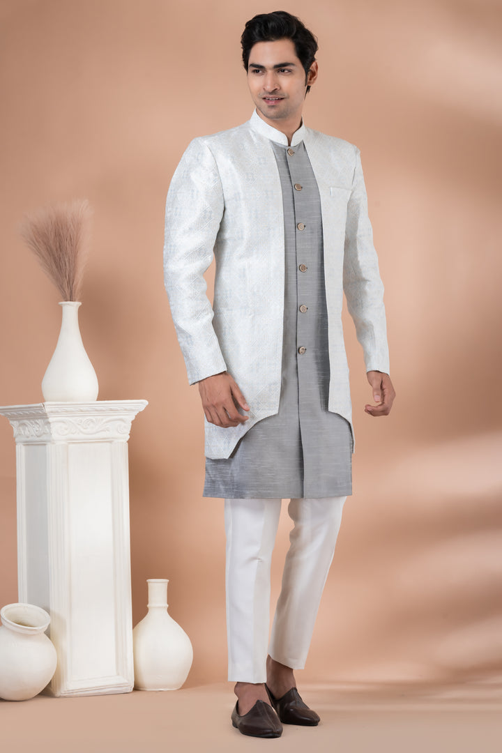 Understated luxury meets timeless tradition in this Ivory & Silver Indo-Western Set, curated for men who appreciate minimalism with a majestic touch.