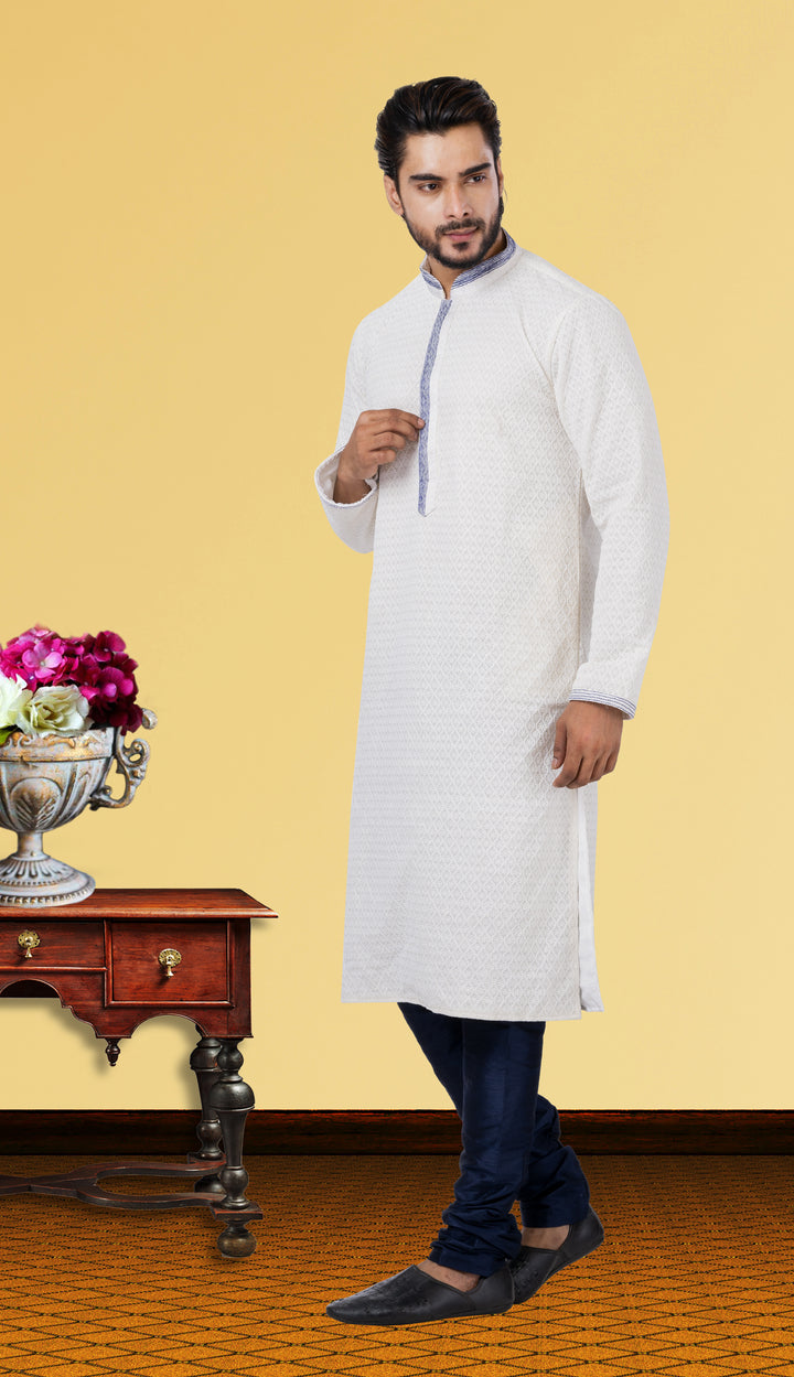 Sleek, minimal, and timeless — this ivory white kurta from Angasudha is perfect for those who prefer elegance with simplicity. Crafted from finely textured georgette, it features a contrast striped placket and collar that add a subtle modern touch. Paired with rich navy dupion silk pyjama, this set offers the perfect ethnic look for formal and festive occasions.