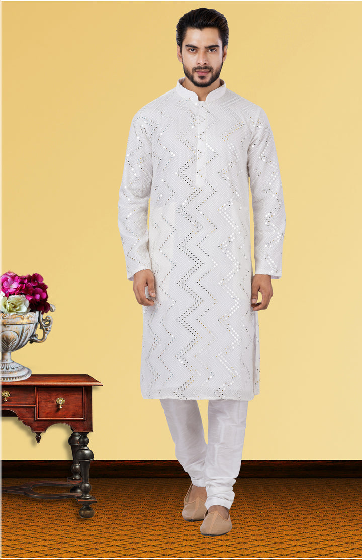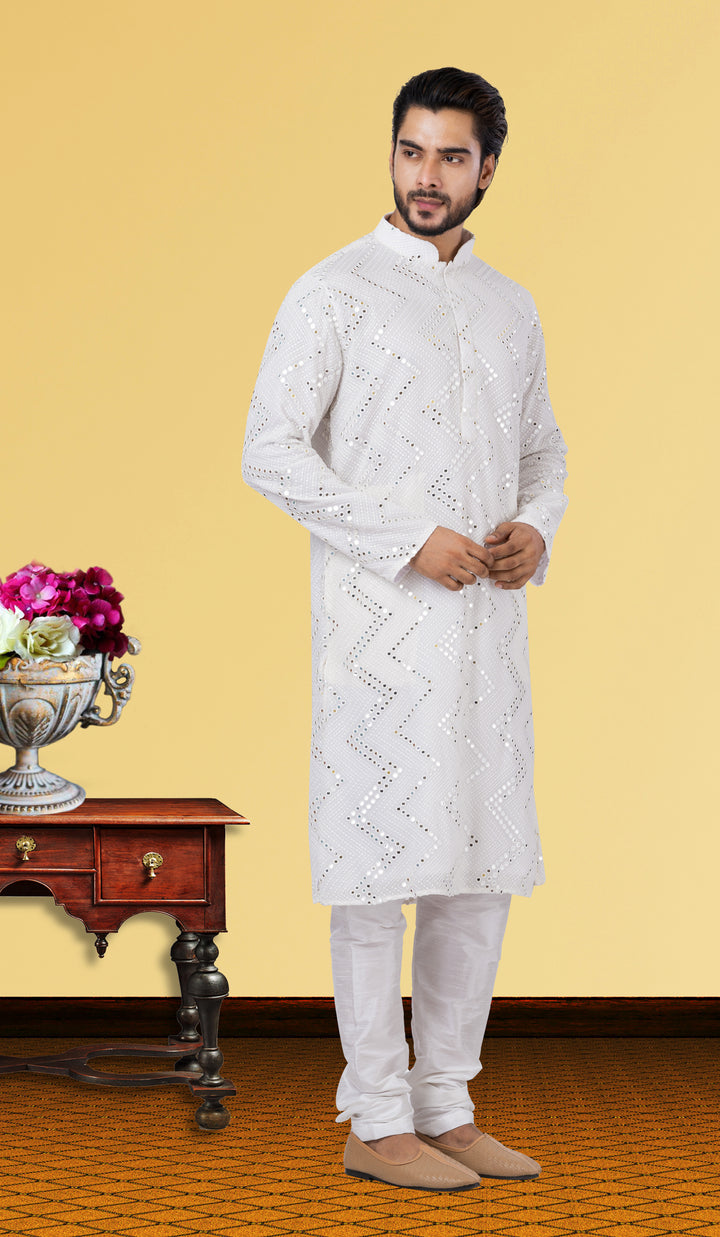 Elevate your ethnic wardrobe with this elegant ivory kurta set from Angasudha. Designed in breathable georgette and highlighted with bold zigzag mirror embellishments, it captures charm and tradition in every stitch. Teamed with a white dupion silk pyjama, this ensemble is your go-to for pure, polished celebration style.