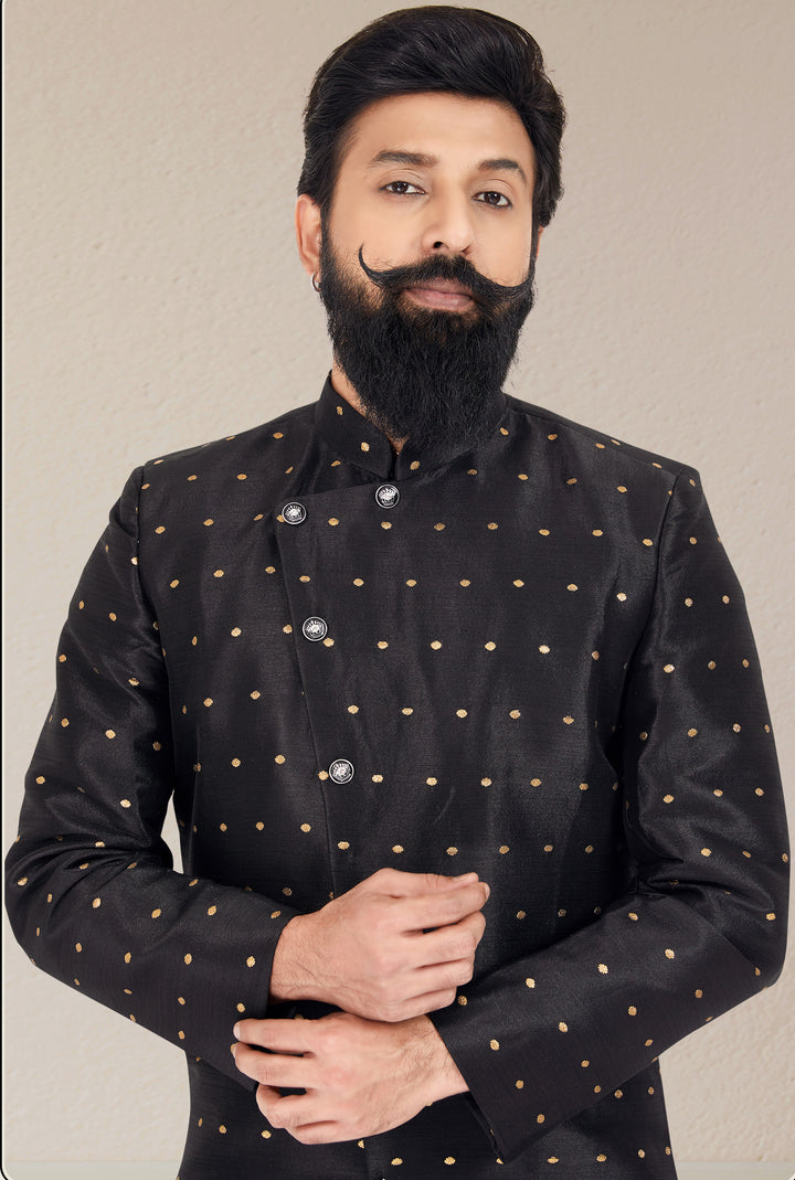 Sophistication meets tradition in this striking Indo Western set by Angasudha. The top features a bold jet black base adorned with subtle golden polka embroidery, elevated by a unique side-buttoned placket and a regal silhouette. Paired with golden dhoti pants, this outfit is designed for those who want to make a memorable impression with refined style.