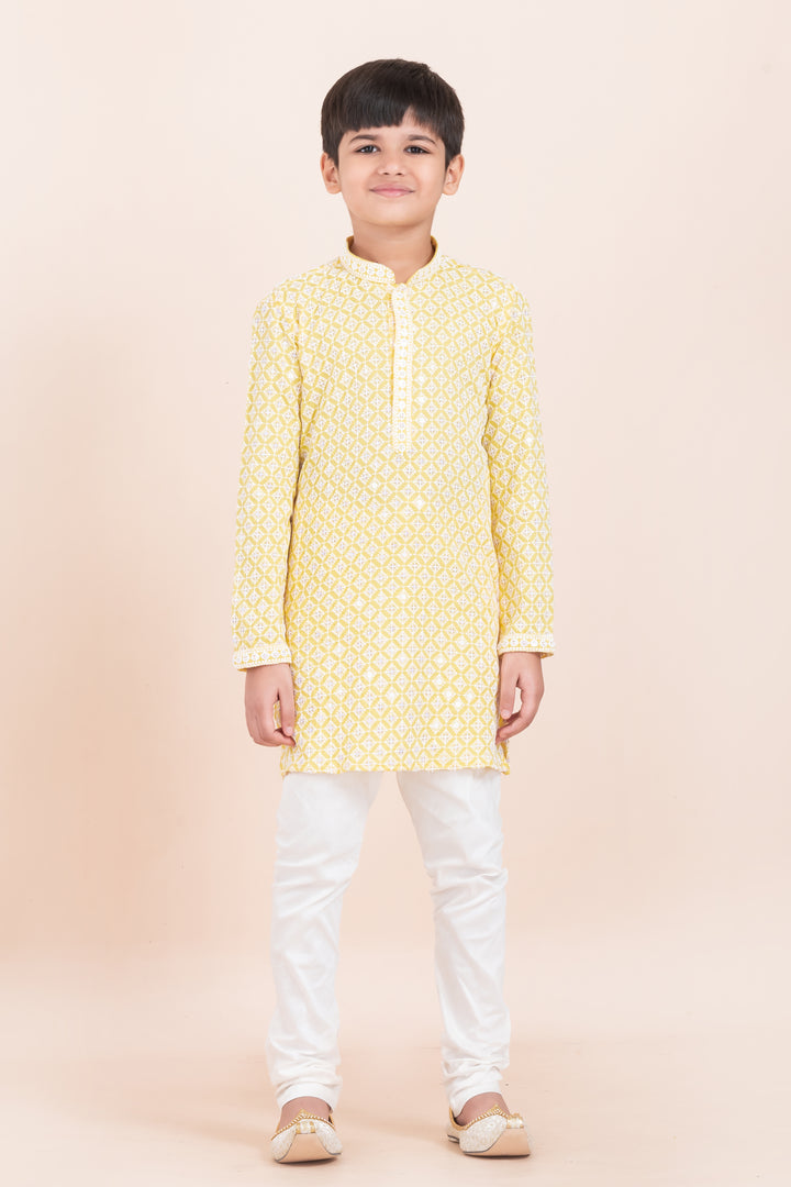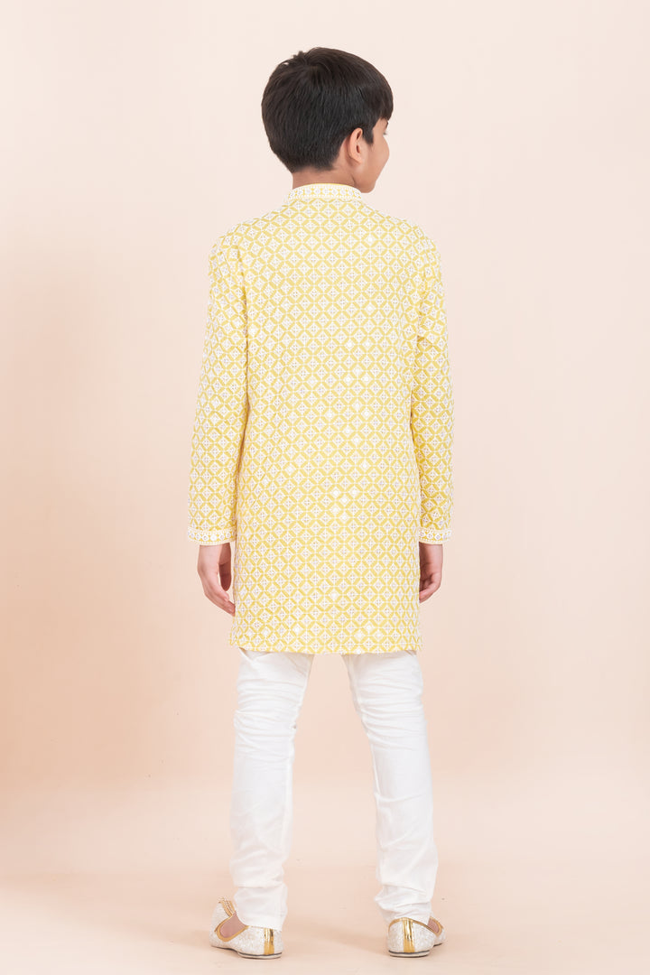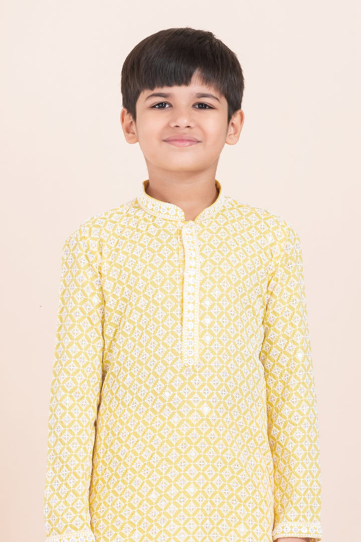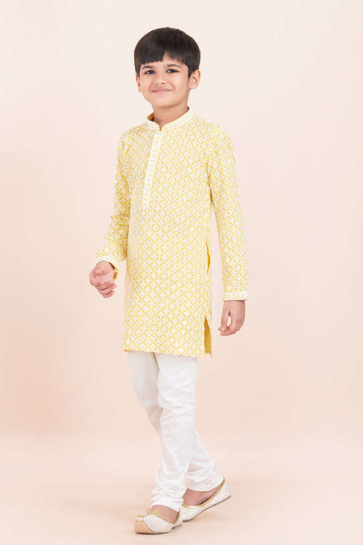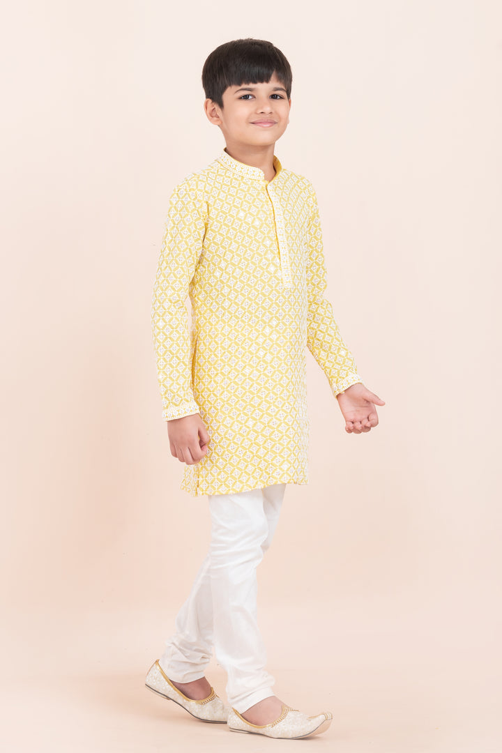 Angasudha Lemon Yellow Printed Cotton Kurta Set for Boys