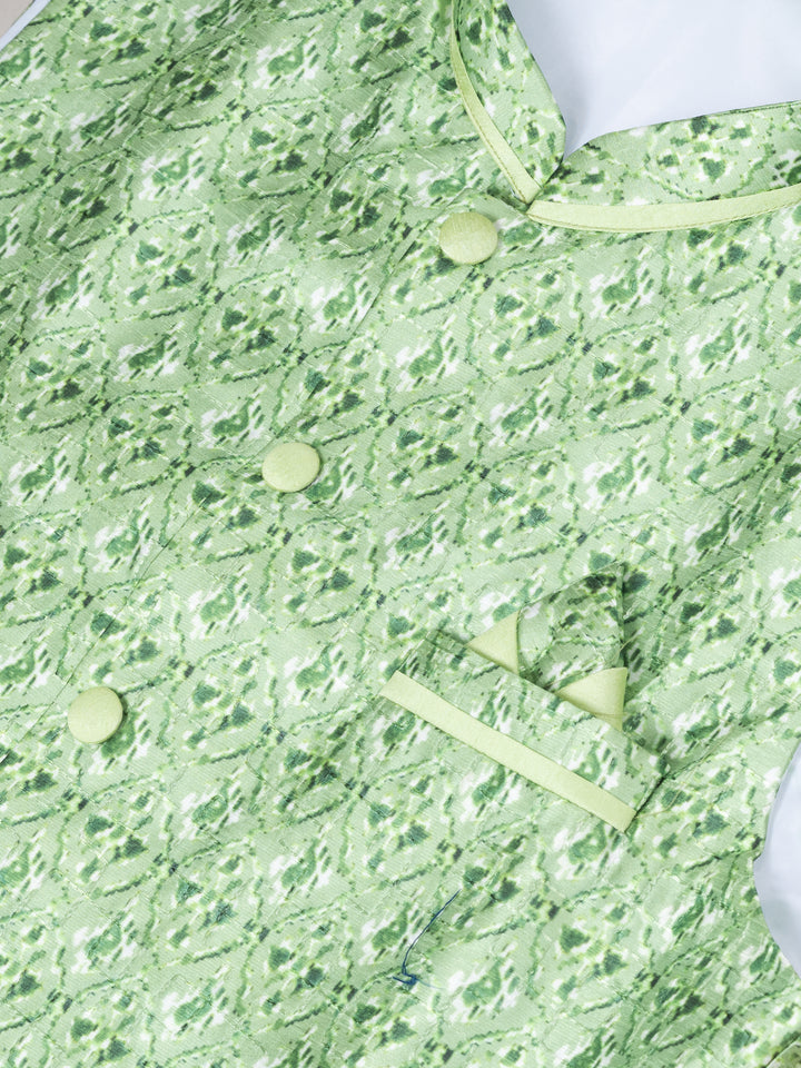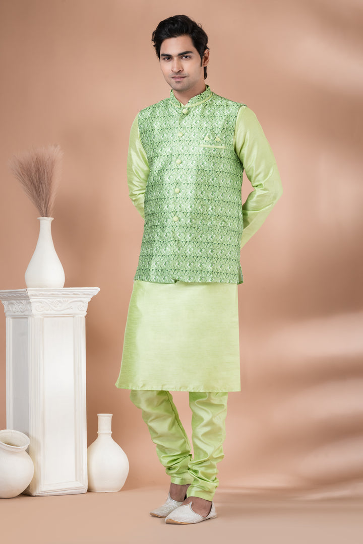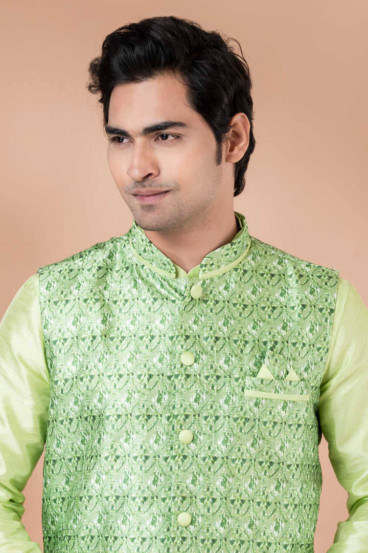 Radiate festive charm with this luminous ethnic set from Angasudha. The ensemble features a light green Banarasi silk kurta and pyjama, known for its refined sheen and smooth texture. The outfit is crowned with a matching self-embroidered silk jacket, intricately designed with floral motifs and complemented by classic fabric buttons and a pocket square for a princely touch.