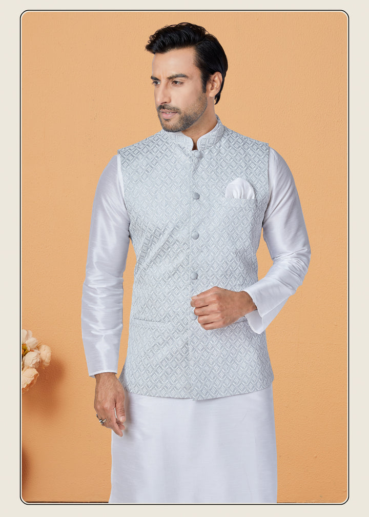 Angasudha Light Grey Diamond Weave Waistcoat with White Kurta Pyjama Set