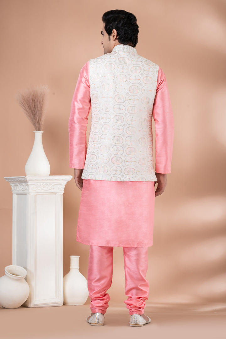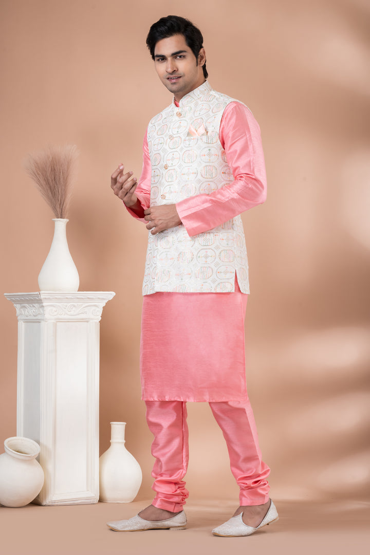 Angasudha Light Peach Banarasi Silk Kurta Pyjama with Ivory Embroidered Nehru Jacket
