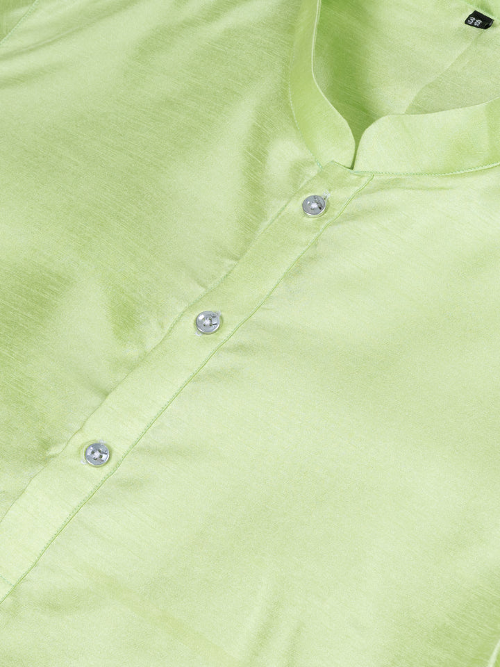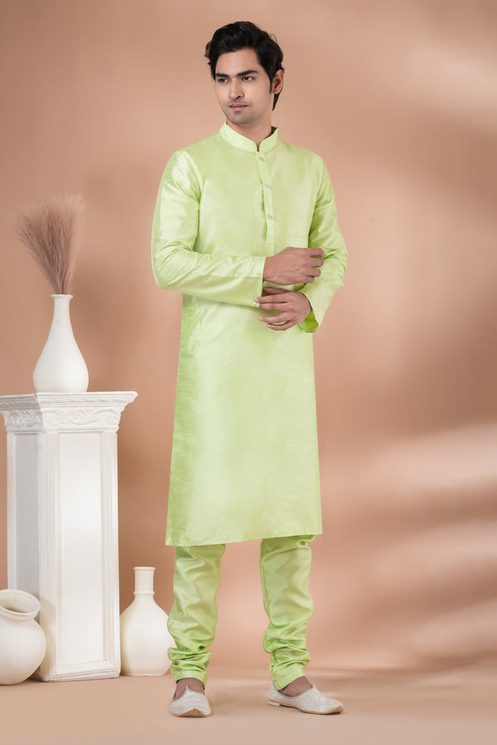 Radiate freshness and charm with the Angasudha Lime Glow Kurta Set. Tailored from smooth and lustrous Dupion Silk, this solid lime green ensemble is all about vibrant simplicity. The kurta features a crisp mandarin collar, a minimalist button placket, and a soft sheen that adds richness to its playful tone.