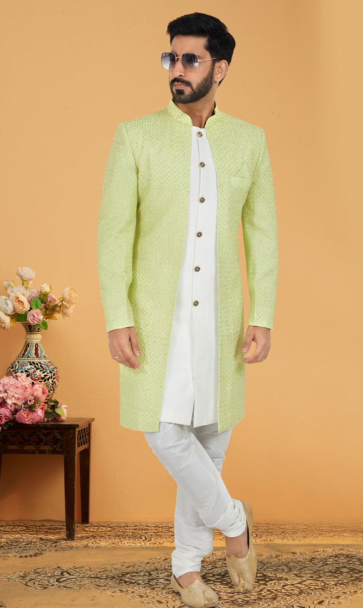 Jacket Fabric: Light lime green art silk with delicate self-embroidered sequins work, adding soft shimmer and a festive vibe.