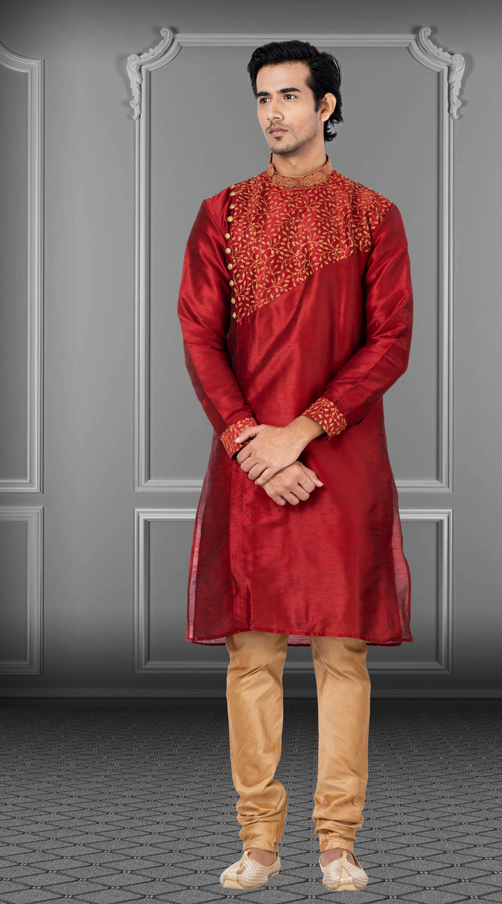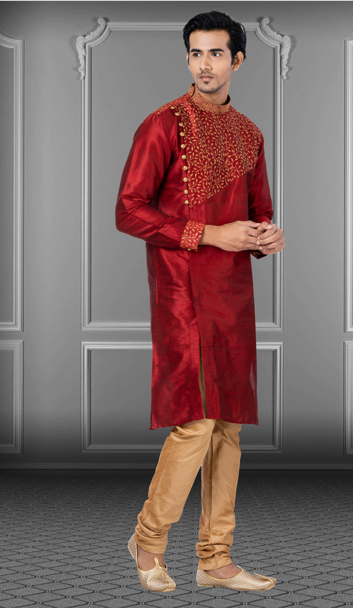 Make a statement in festive elegance with this Angasudha designer kurta set. Crafted from rich maroon art silk, the kurta features an asymmetrical yoke adorned with intricate golden embroidery and a stylish side-button placket. The embroidered mandarin collar and cuffs add a regal finish, while the golden churidar pyjama perfectly complements the rich tones of the outfit.
