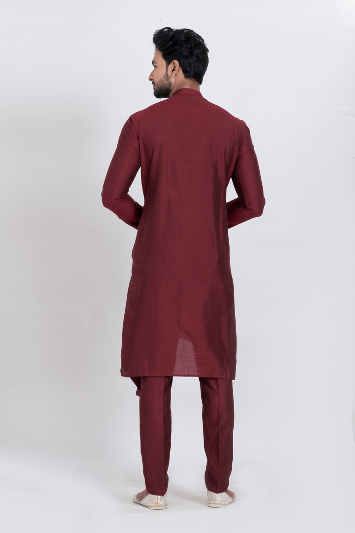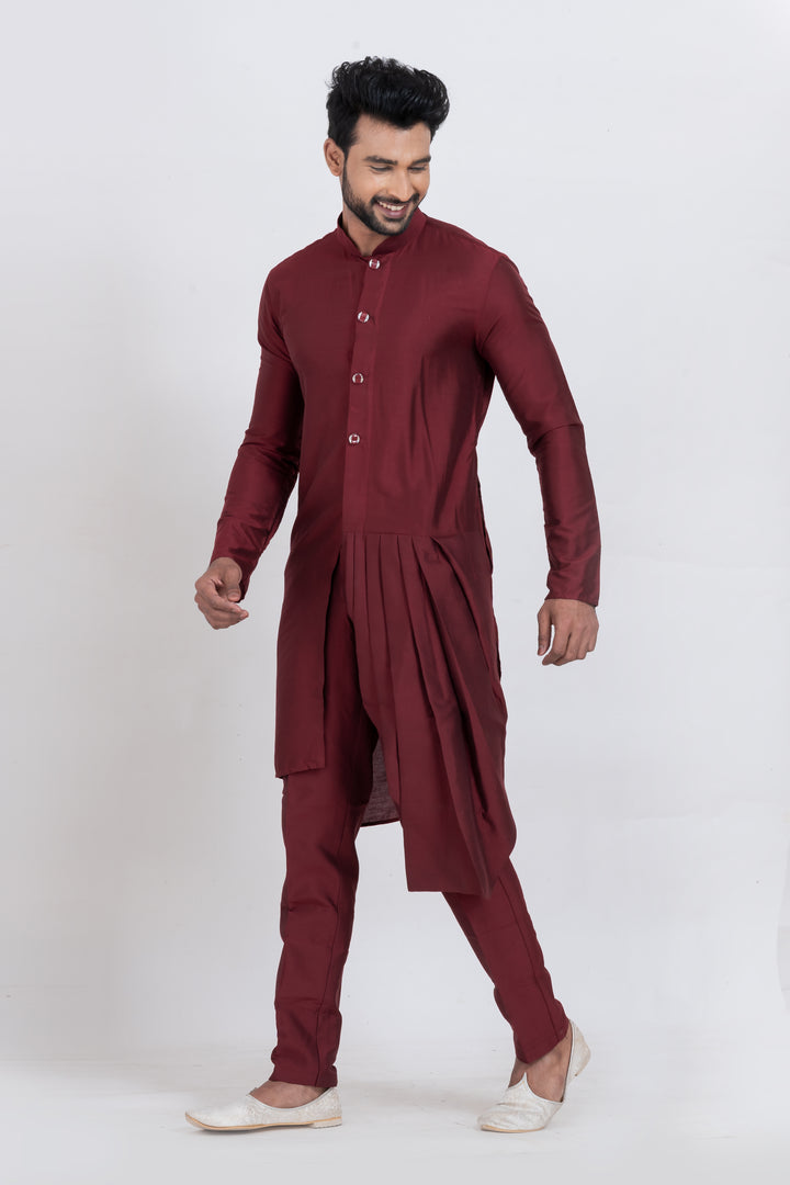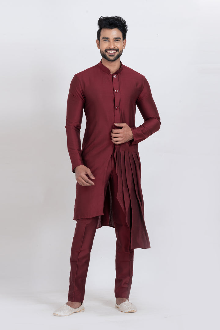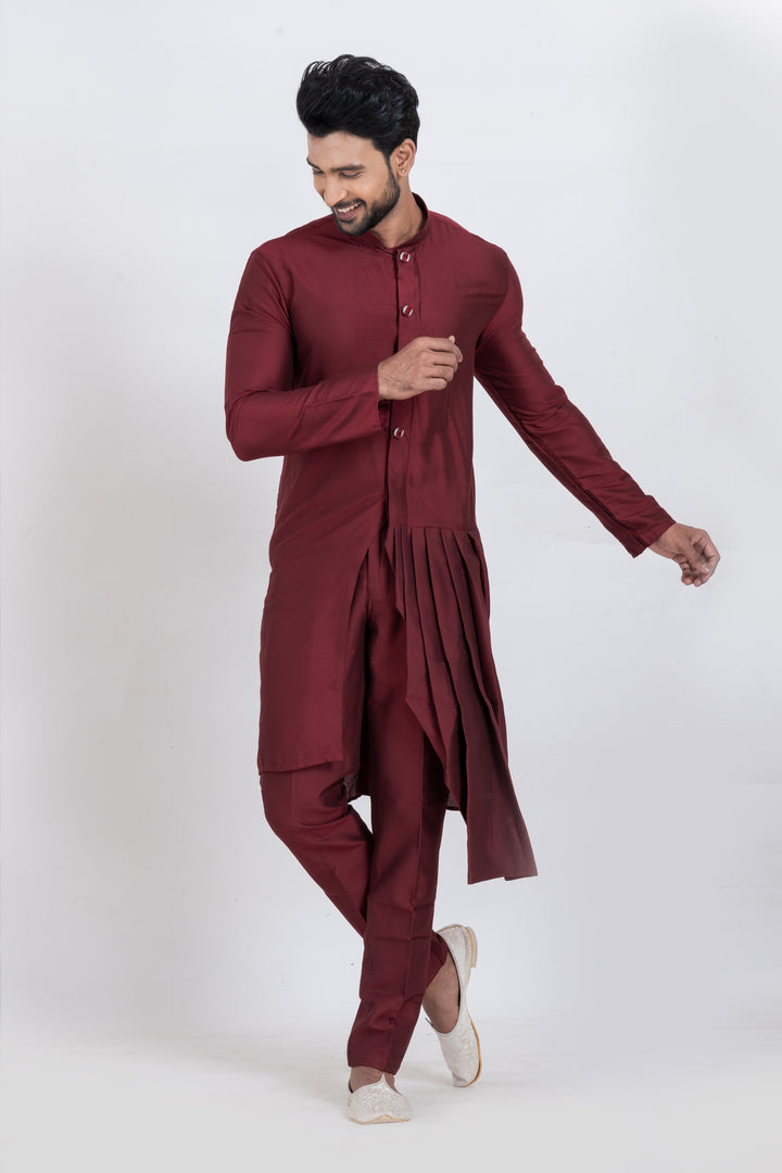 Make a bold style statement with this contemporary maroon Indo-Western kurta set, designed for the modern man who dares to stand out. Crafted from premium fabric, this ensemble features a structured silhouette with an asymmetrical cut and dramatic front pleats that exude fashion-forward sophistication. The classic bandhgala collar and minimal button detailing add to its sleek, royal vibe. Paired with matching straight-fit trousers, it's an ideal pick for upscale events.