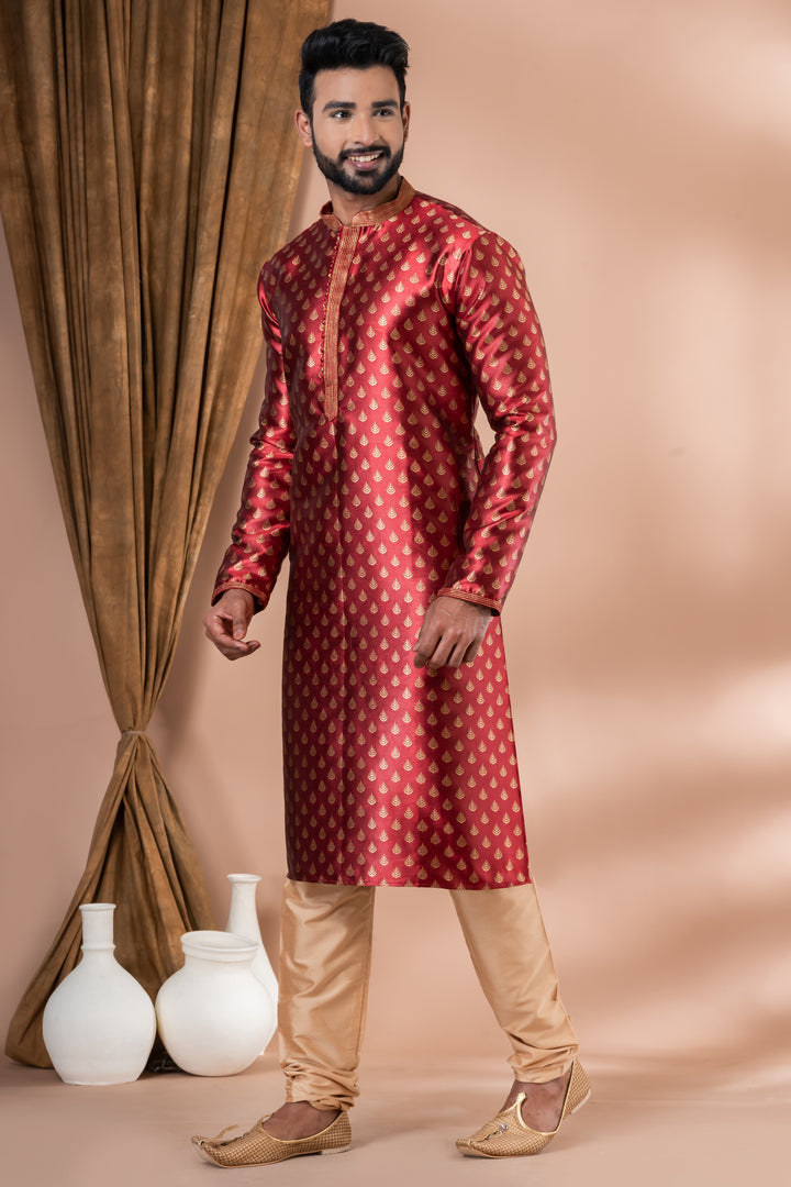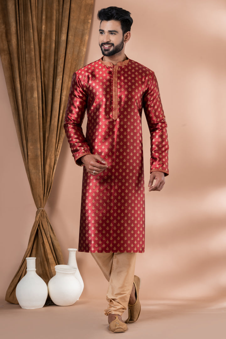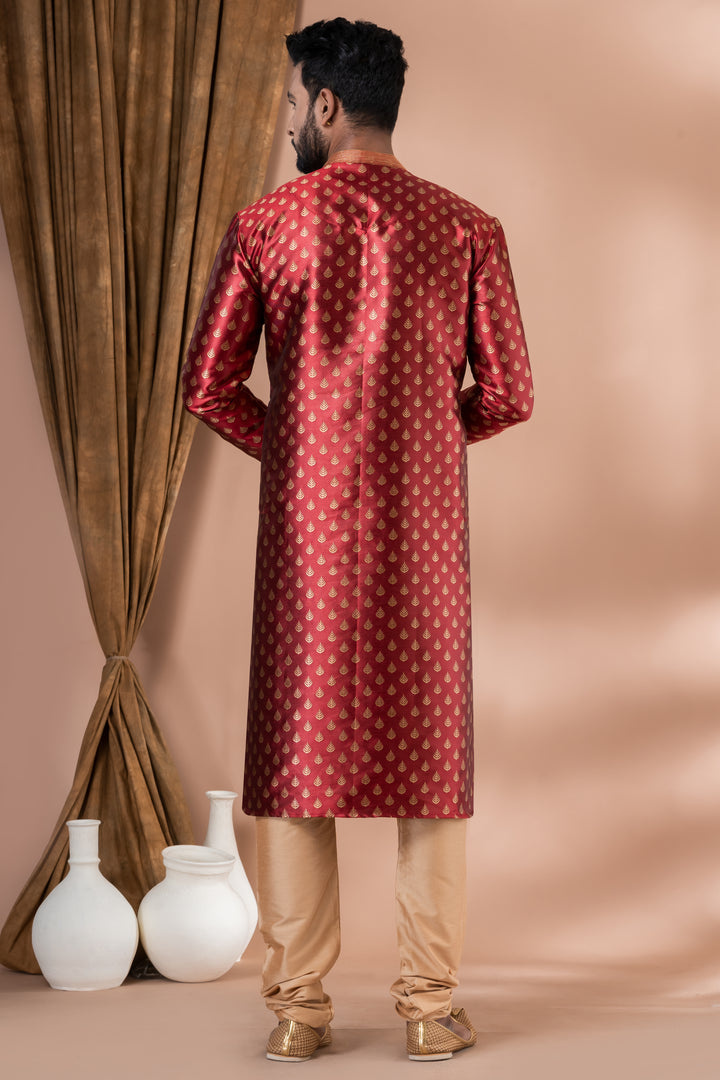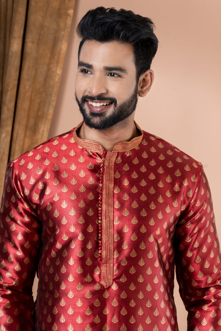 Celebrate tradition in vibrant elegance with this Maroon Jacquard Silk Kurta Set, designed to make a royal statement at every cultural occasion. The kurta features intricate golden woven motifs all over, complemented by a detailed placket and mandarin collar, giving it a regal yet timeless look.