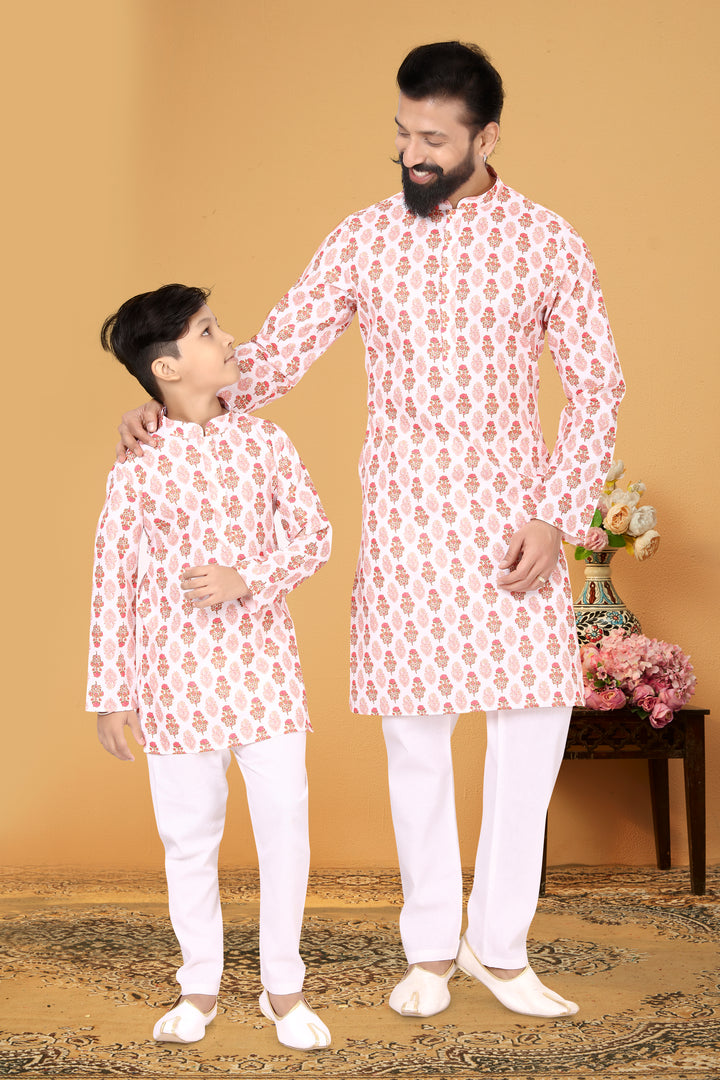 Celebrate festive moments in style with our charming Matching Father-Son Kurta Set. This elegant duo set features a soft white base adorned with intricate pink floral block prints, perfect for traditional occasions and family gatherings. Made from breathable cotton fabric, both the adult and kids' kurtas ensure all-day comfort and a smart, coordinated look. The set includes straight-cut white pants and is paired with traditional mojaris for a complete ethnic ensemble. Whether it’s for weddings, festivals, or special family portraits, this father-son outfit brings a heartwarming touch of togetherness and elegance.