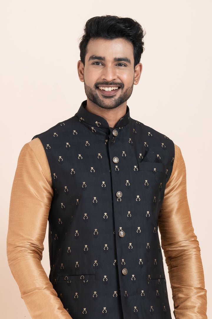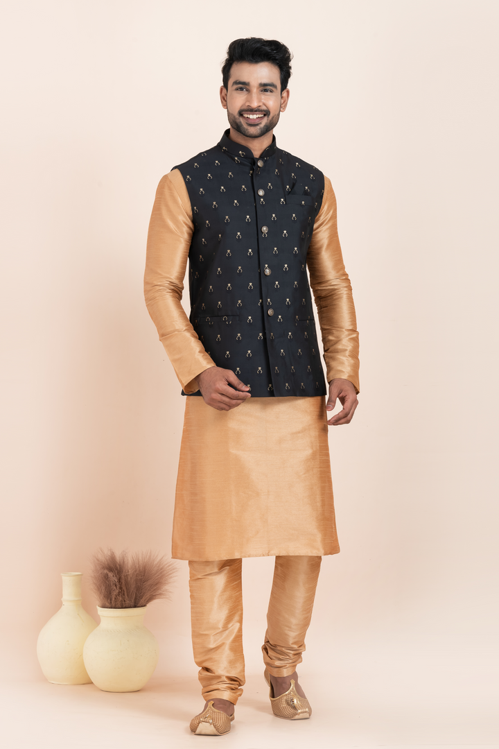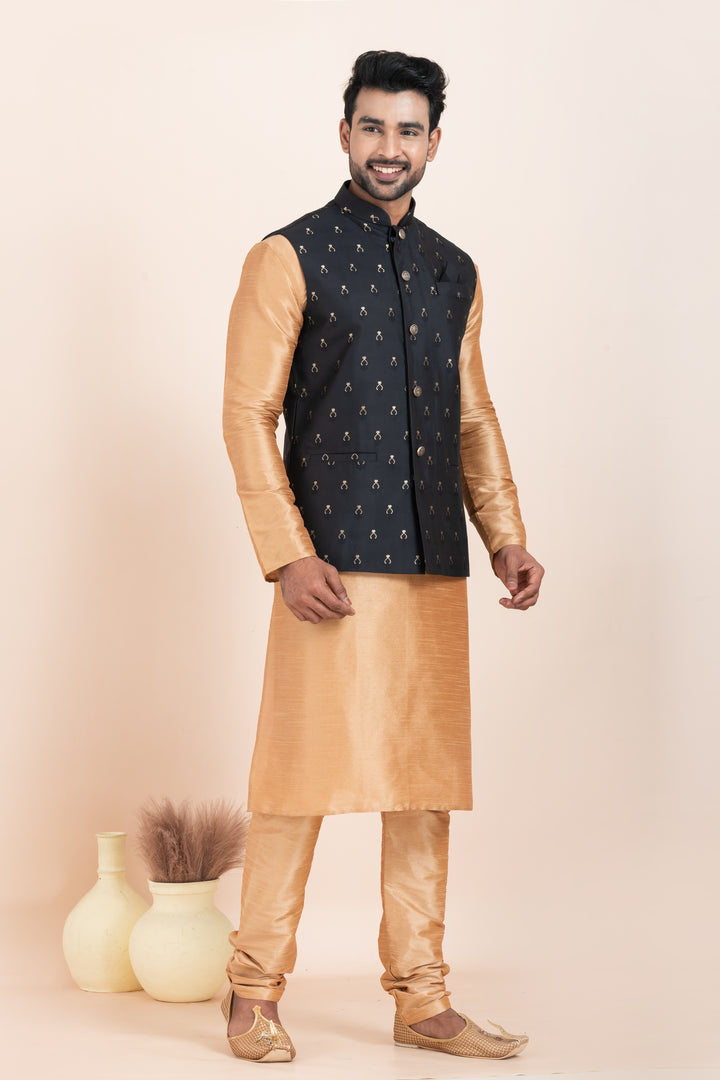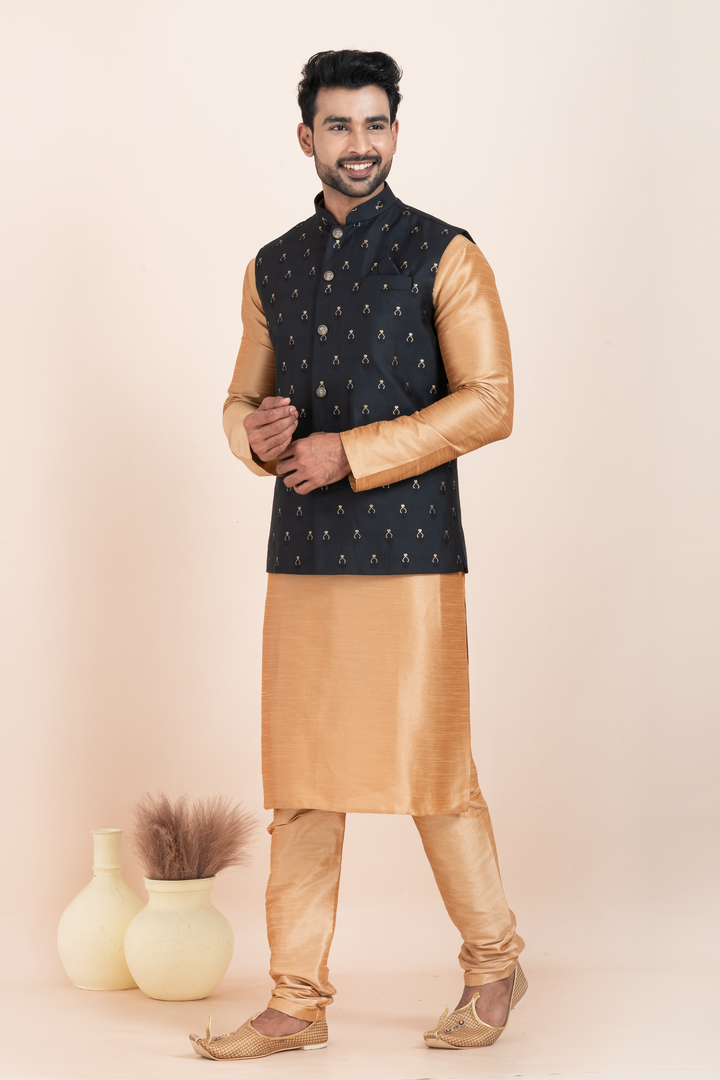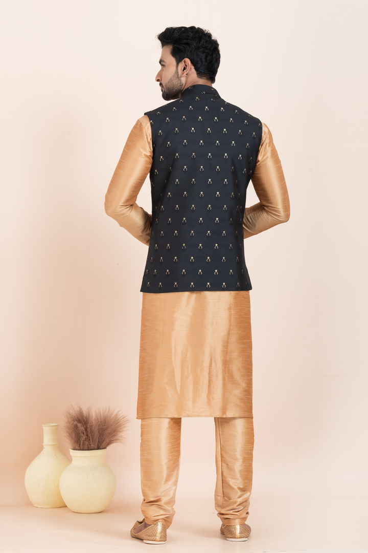Set Includes: Golden Kurta Pyjama and Black Embroidered Nehru Jacket