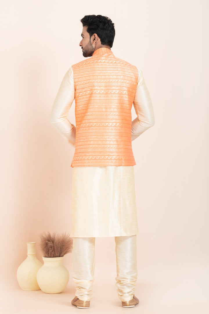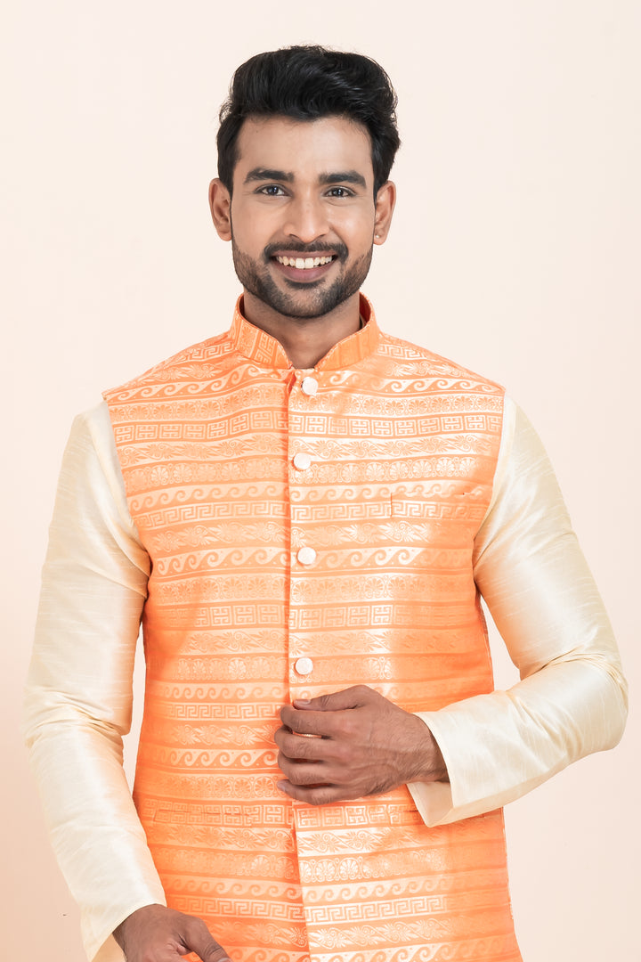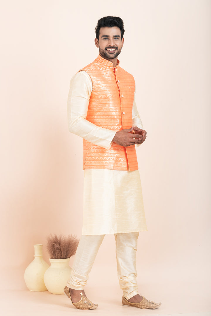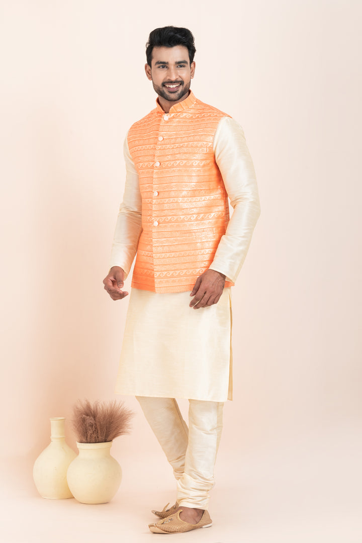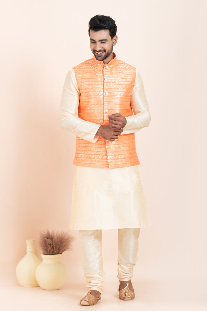 The cream kurta pyjama, tailored from a rich cotton-silk blend, provides a graceful base with a silky smooth finish. It perfectly complements the bright orange Nehru jacket, designed with eye-catching woven brocade patterns, elegant button detailing, and a polished mandarin collar — giving you a traditional yet trendy appearance.