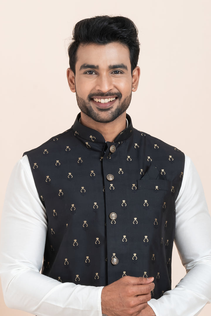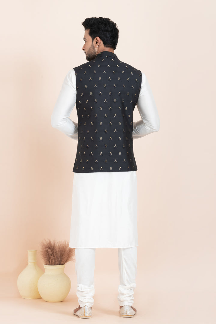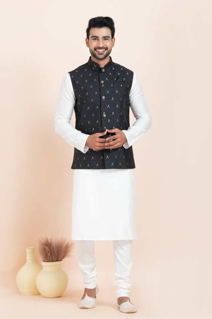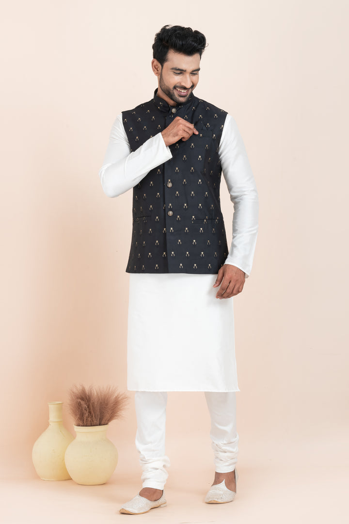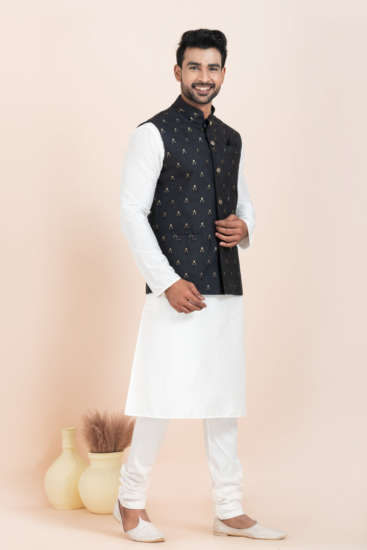 Set Includes: White Kurta Pyjama and Black Embroidered Nehru Jacket