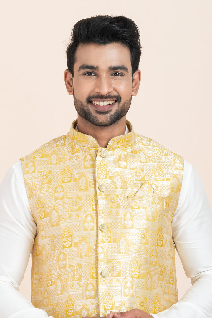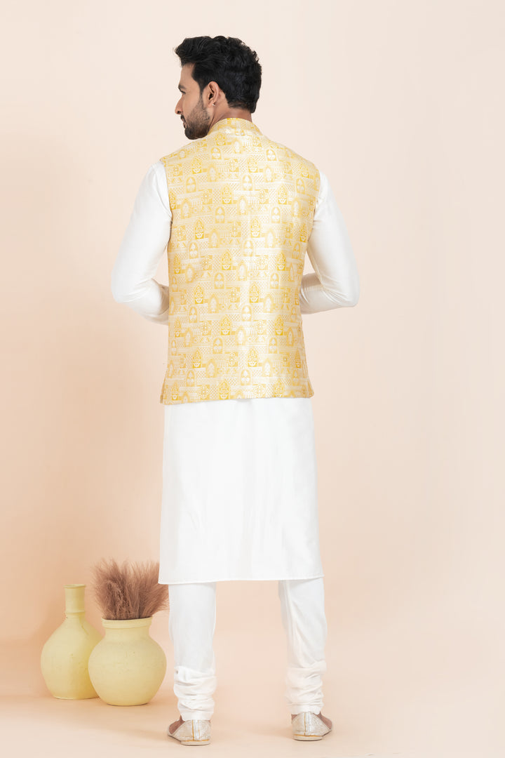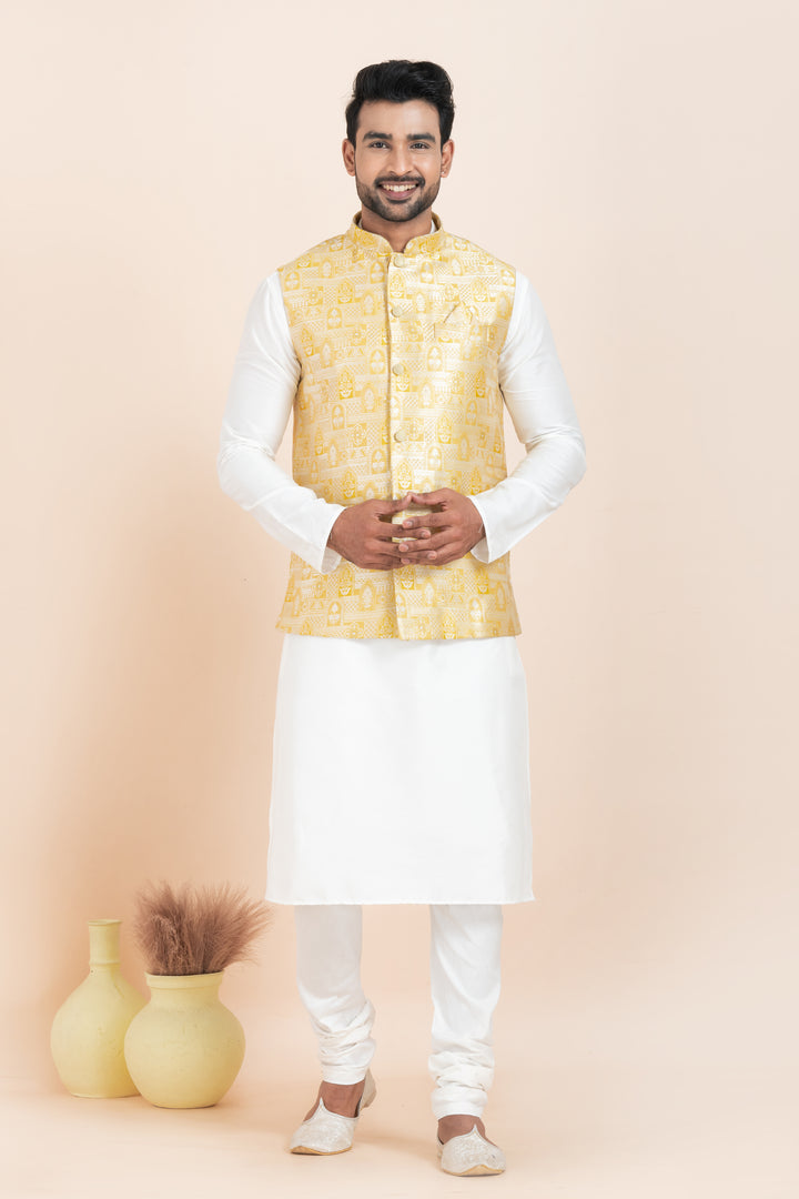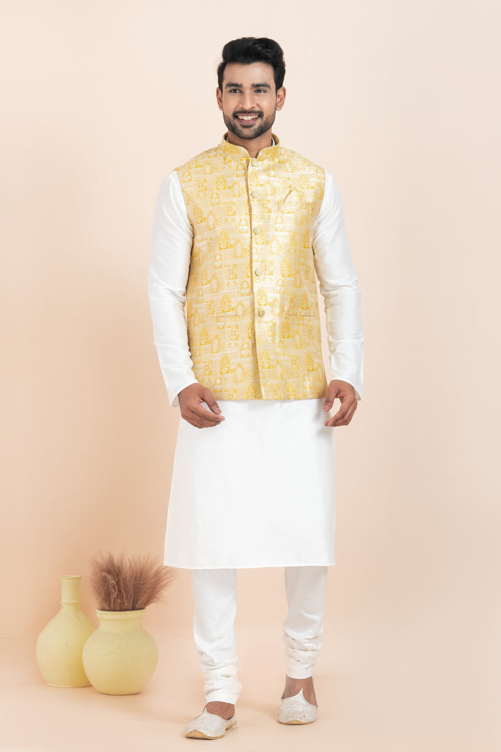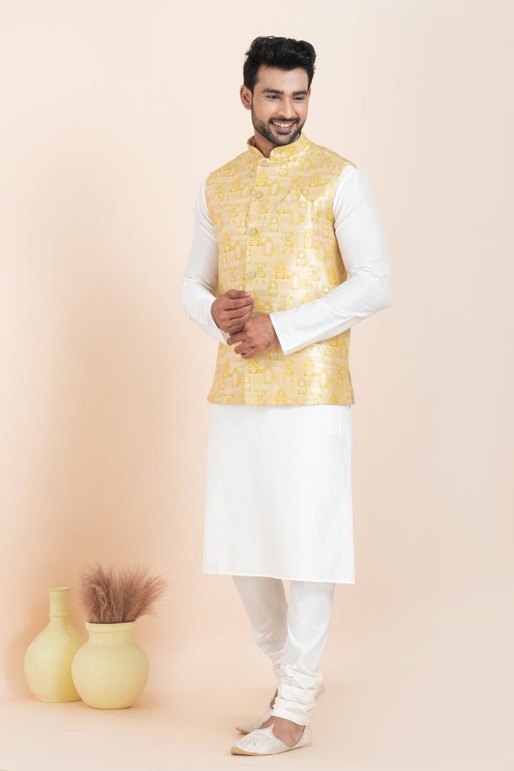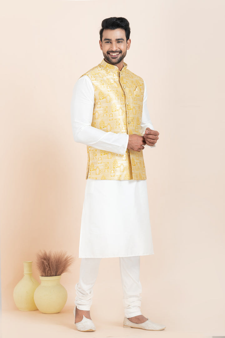 Set Includes: White Kurta Pyjama and Golden Nehru Jacket