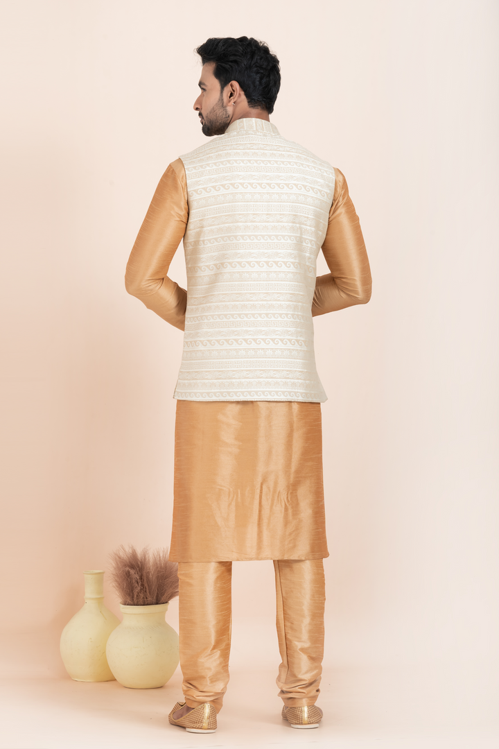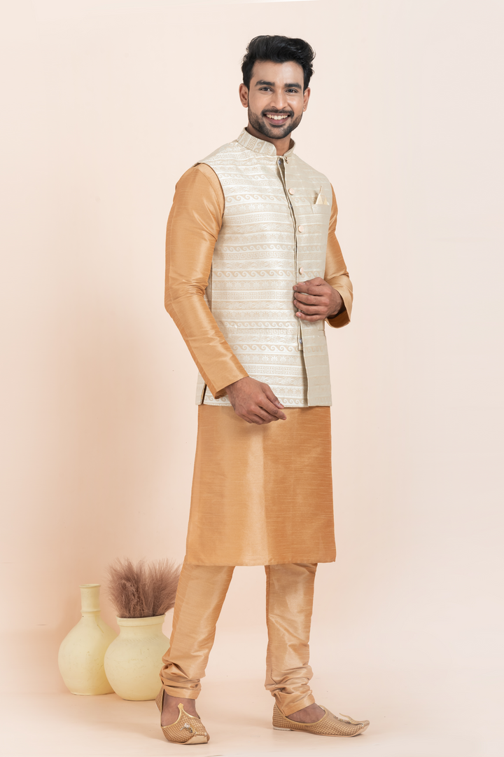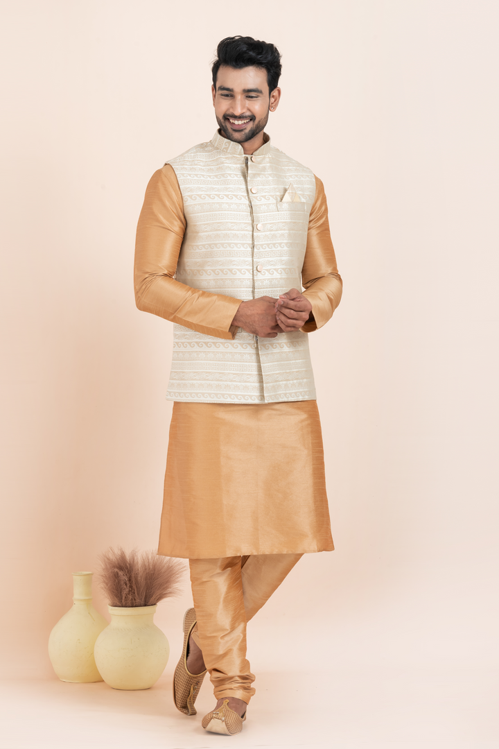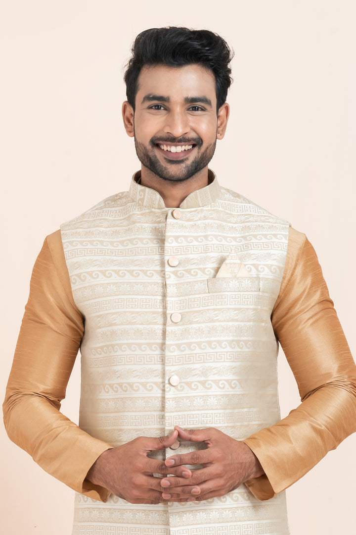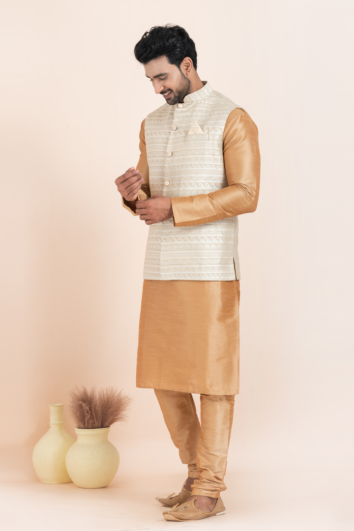 Step into timeless sophistication with this Men’s Ivory Textured Nehru Jacket with Golden Kurta Pyjama Set, crafted to bring out your most graceful and refined self. Perfect for weddings, engagements, or traditional family gatherings, this ensemble offers a radiant blend of simplicity and grandeur.