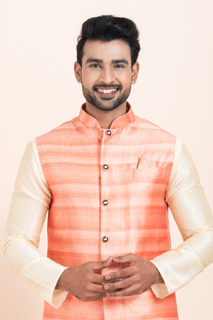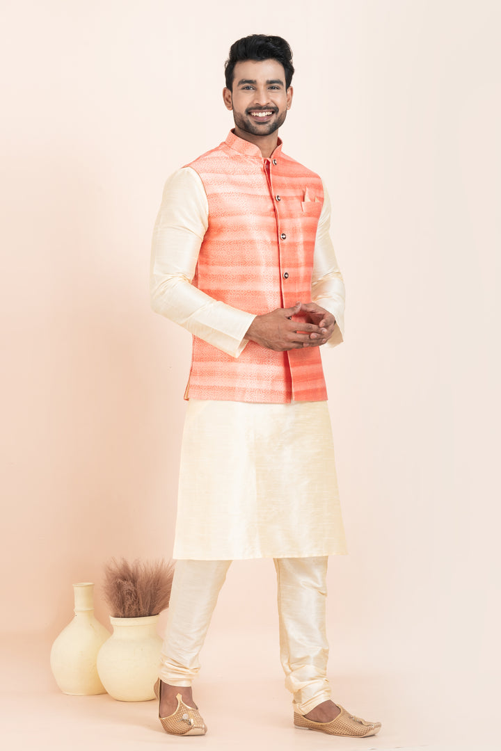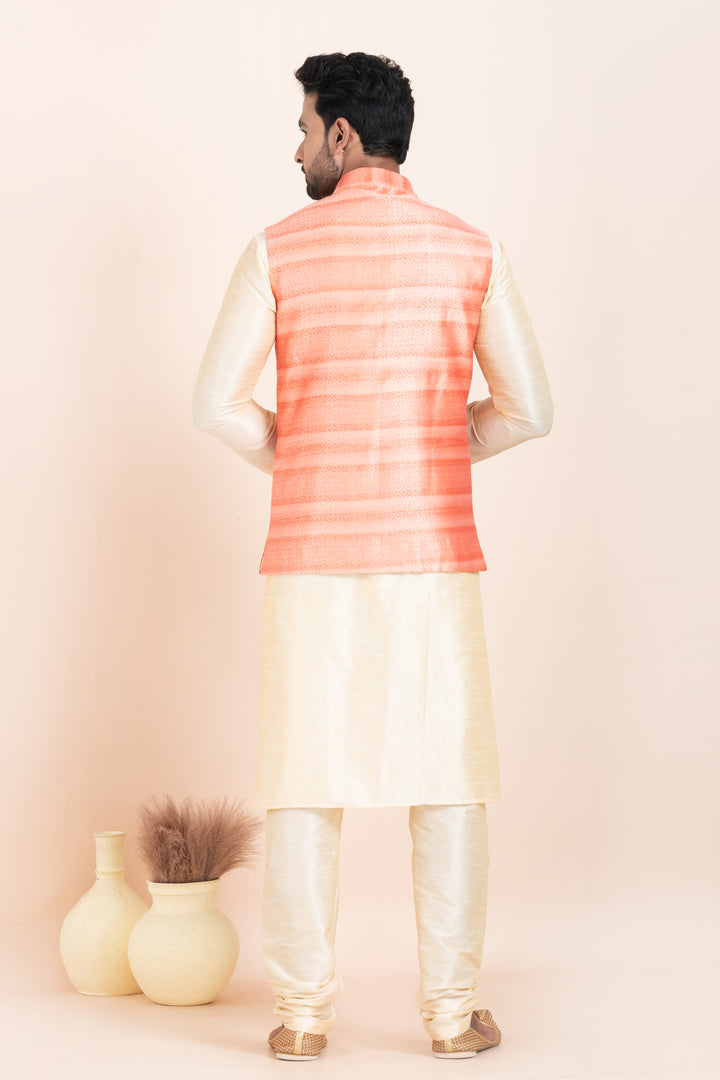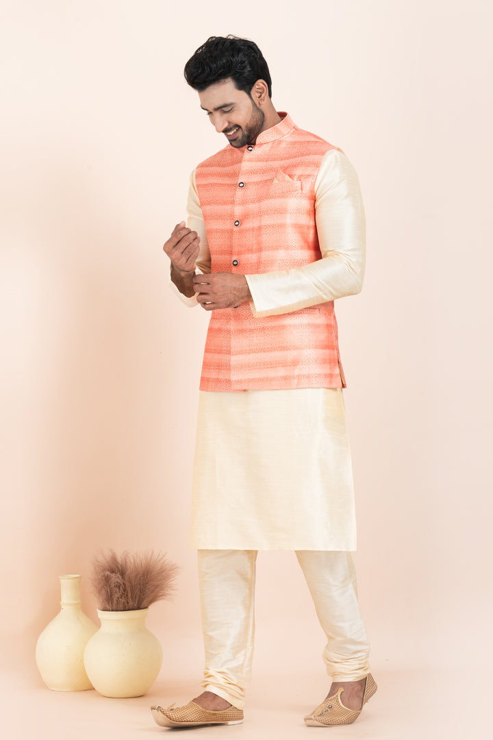 Set Includes: Cream Kurta Pyjama and Peach Jacquard Nehru Jacket