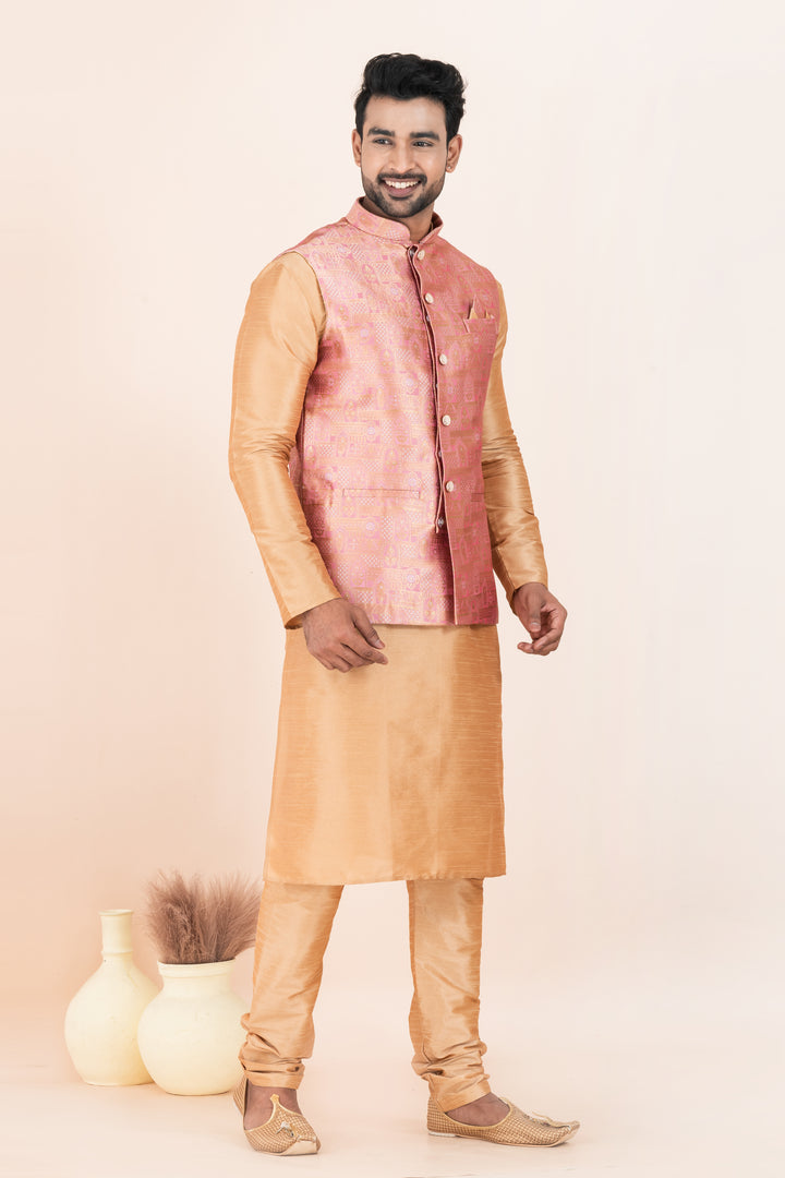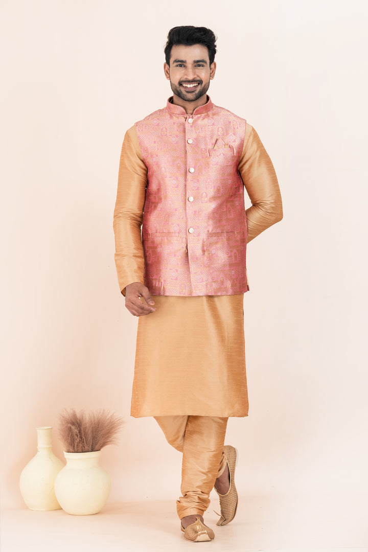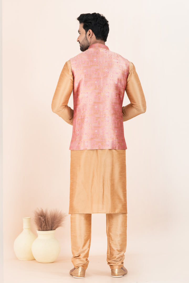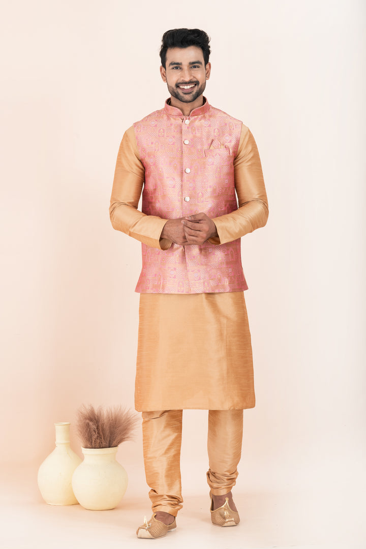 Set Includes: Golden Kurta Pyjama and Rose Pink Jacquard Nehru Jacket