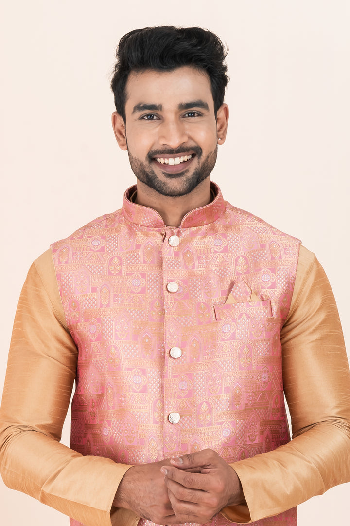 Angasudha Men’s Rose Pink Jacquard Nehru Jacket with Golden Kurta Pyjama Set – A Celebration of Color and Class
