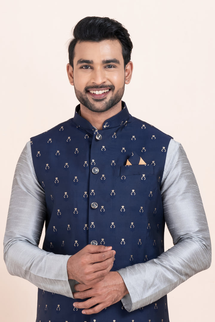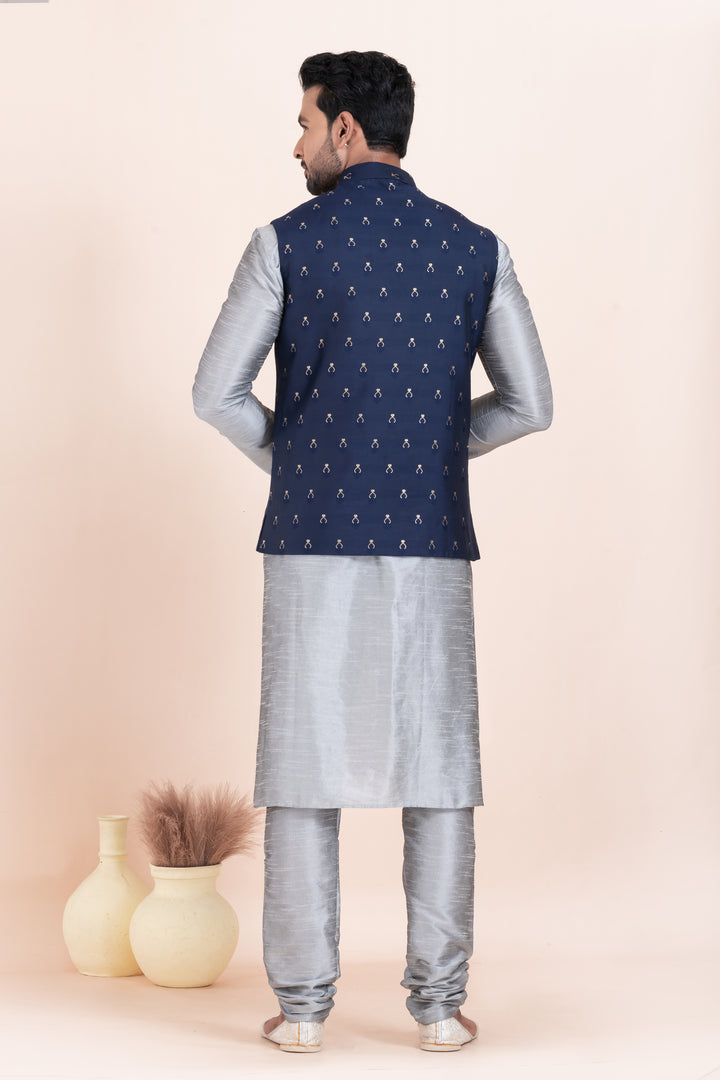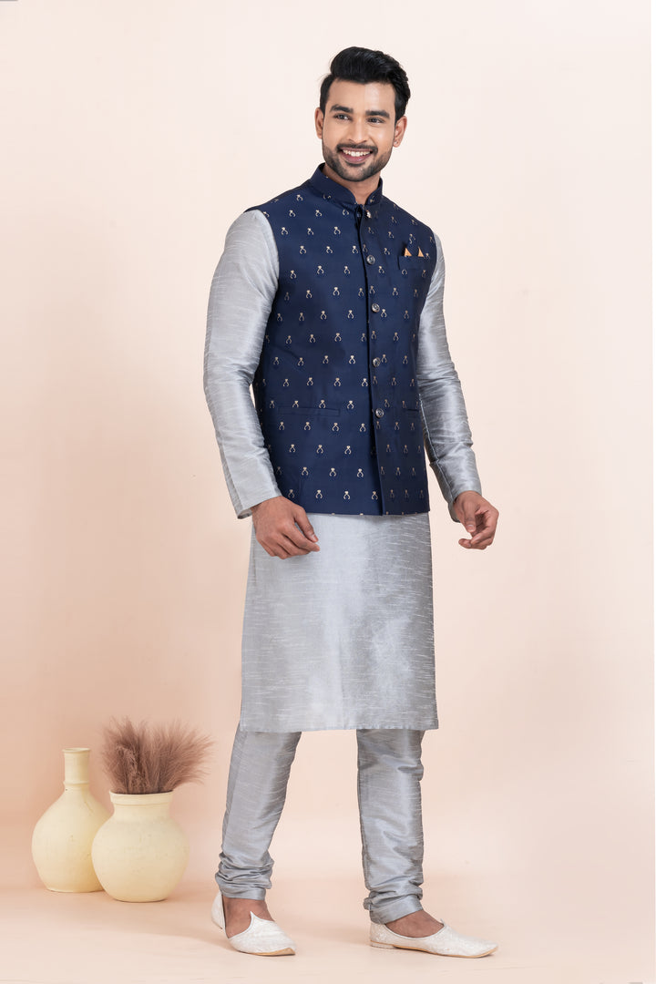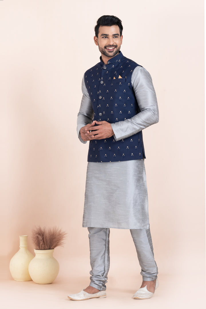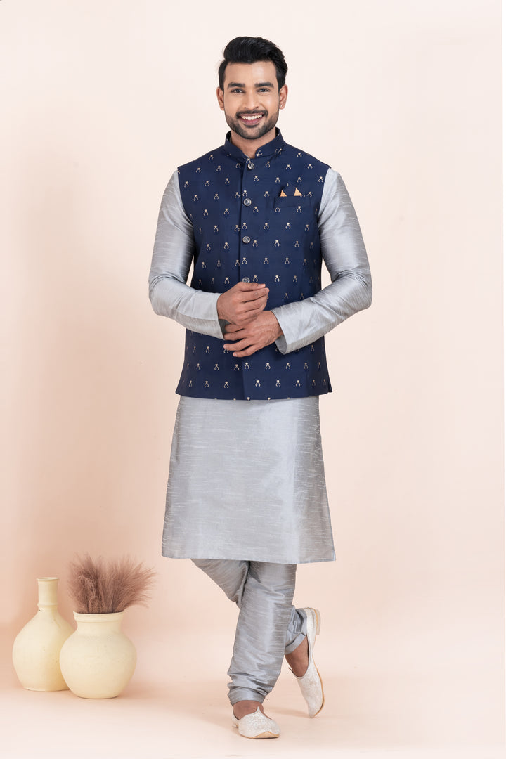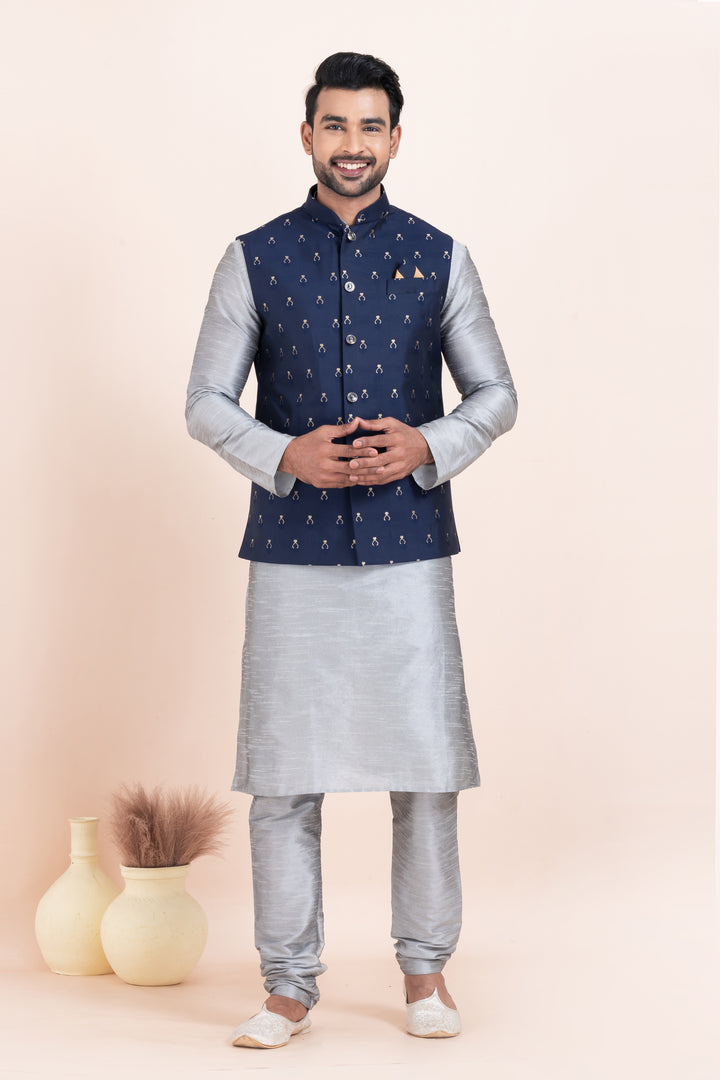 Men’s Silver Kurta Pyjama with Navy Blue Embroidered Nehru Jacket