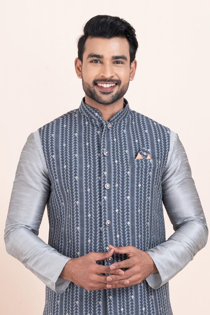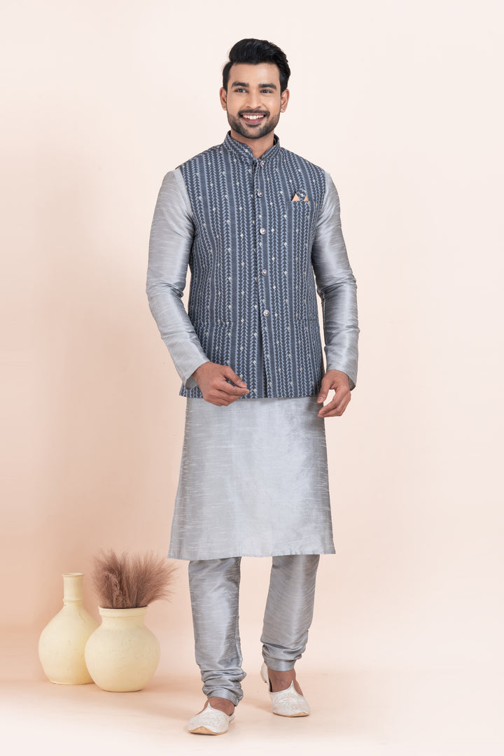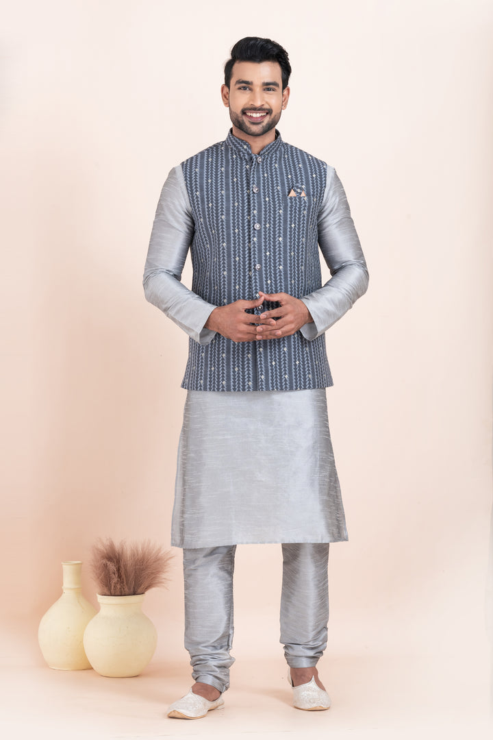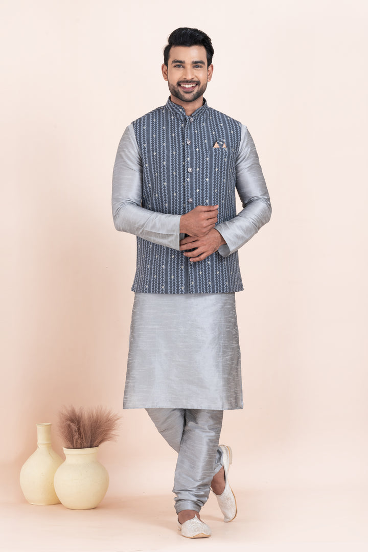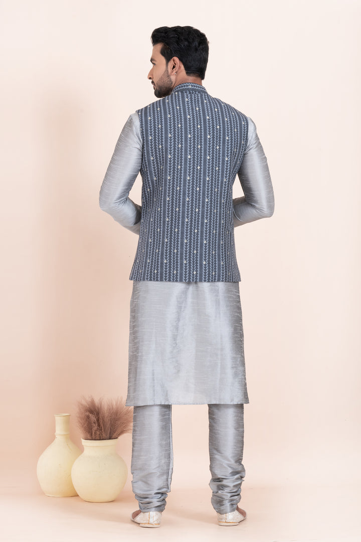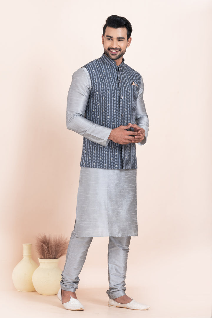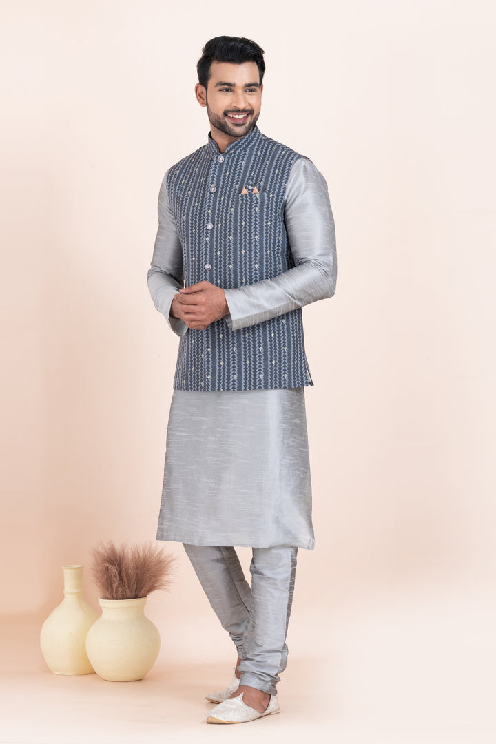 Angasudha Men’s Silver Kurta Pyjama with Navy Blue Thread-Work Nehru Jacket