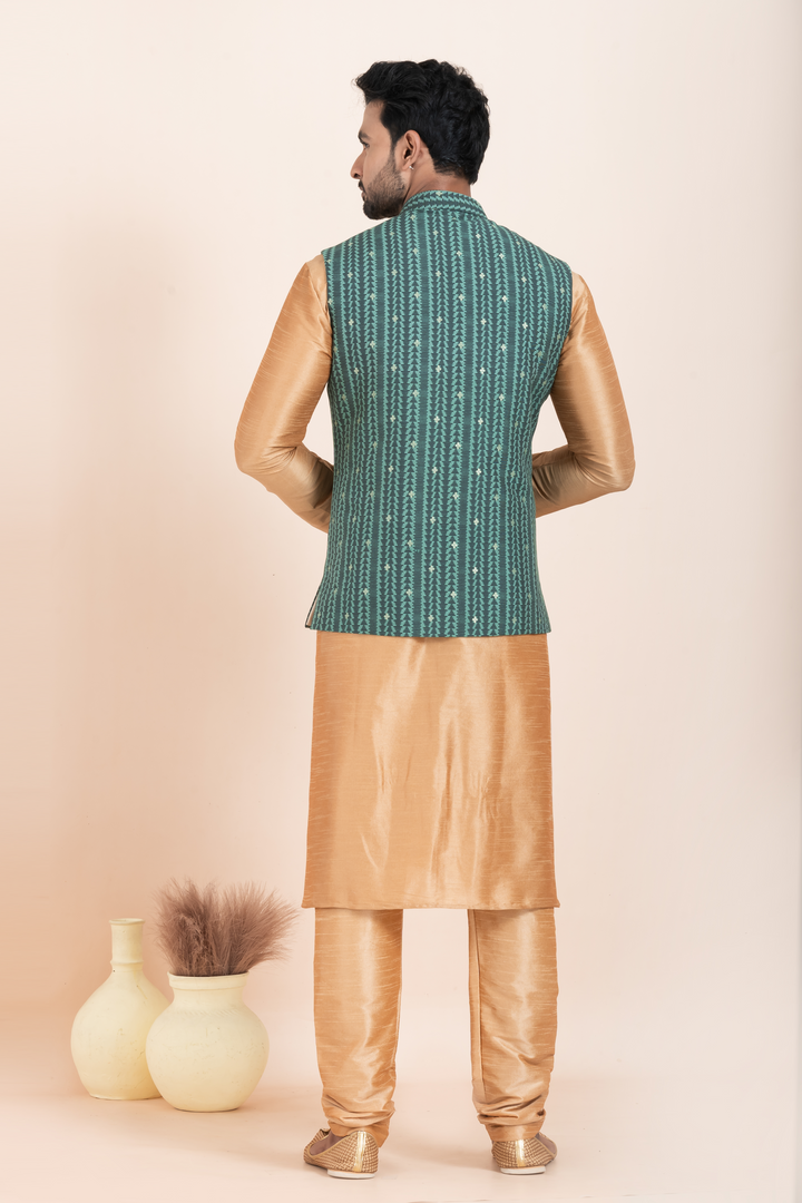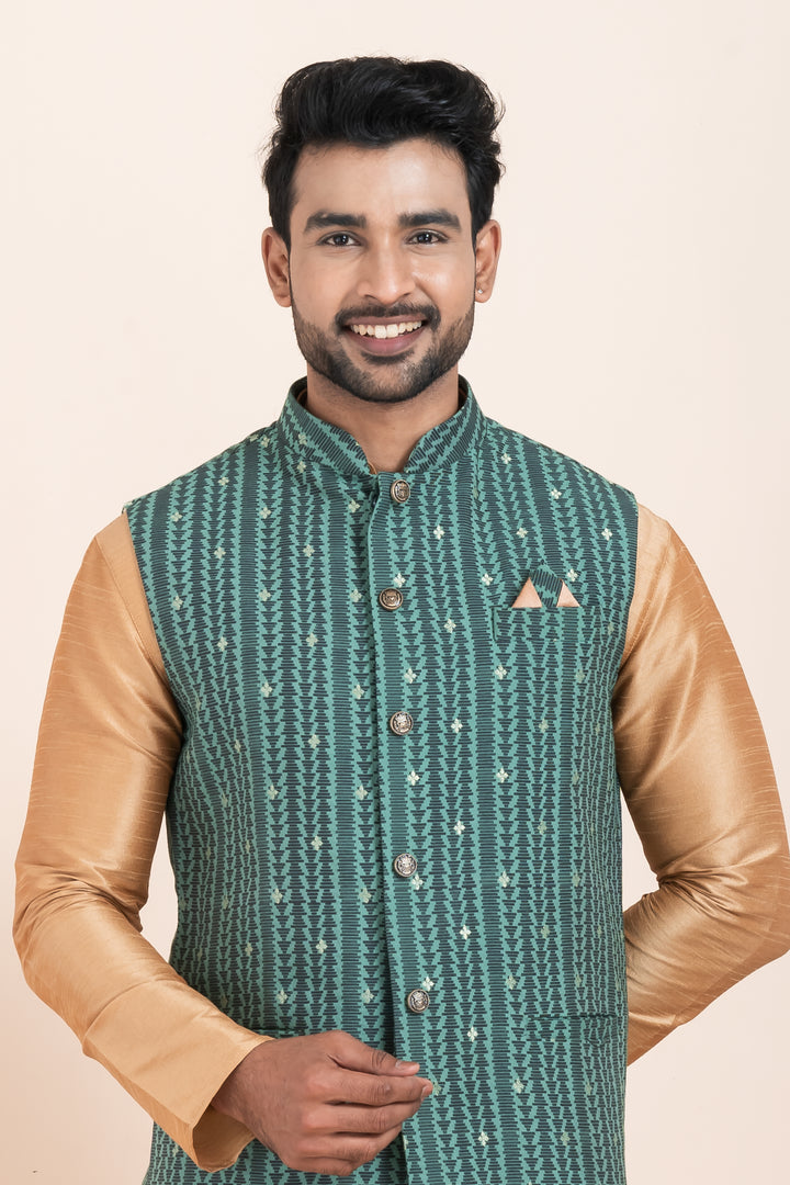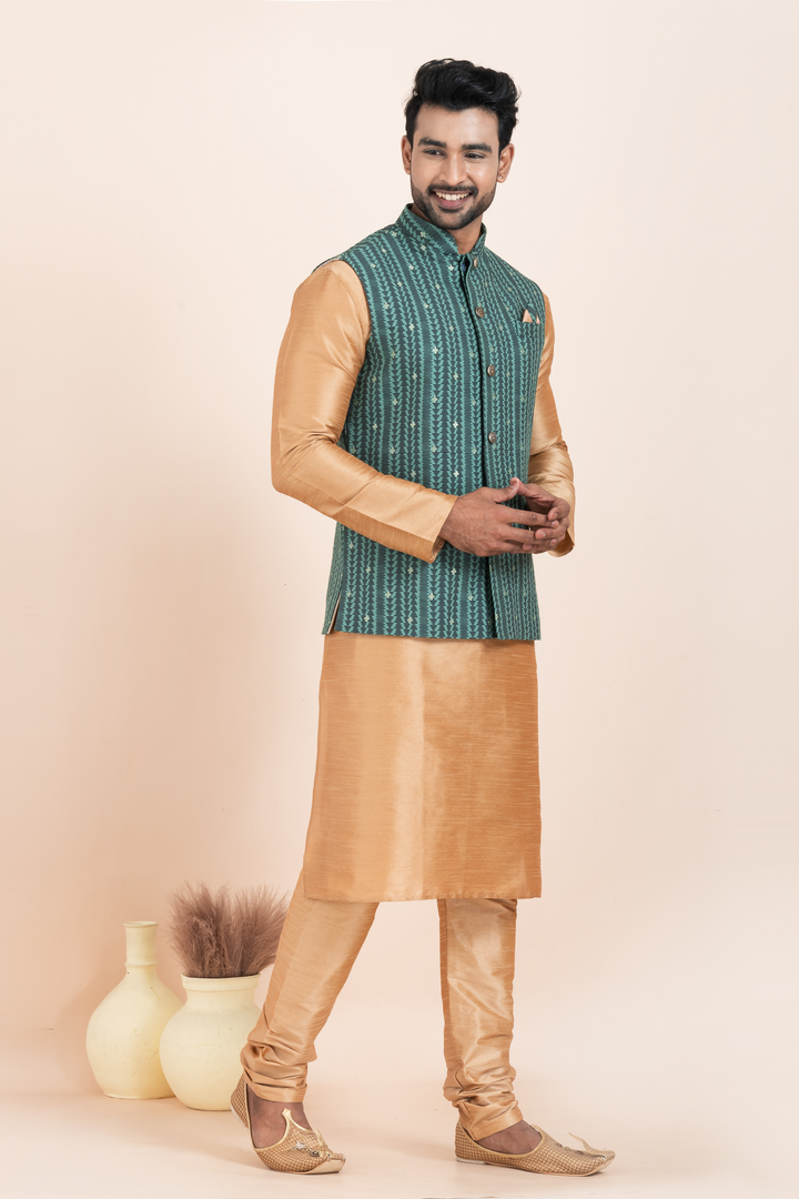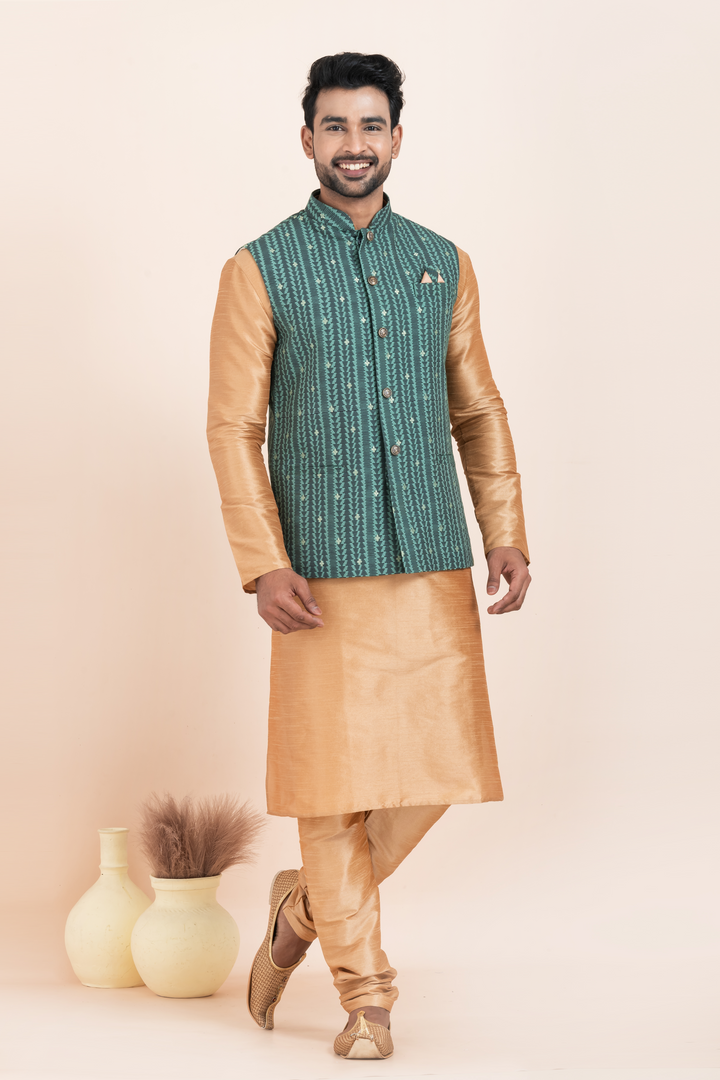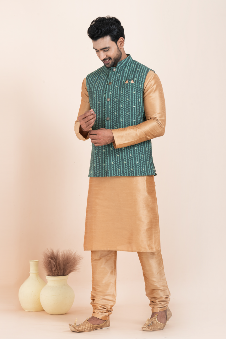 The golden kurta pyjama, made from a luxurious cotton-silk blend, offers a refined look with a subtle sheen. It pairs perfectly with the teal green Nehru jacket, designed with vertical ethnic stripes, textured detailing, and adorned with classic metallic buttons and a sharp pocket square — adding just the right pop of contrast and sophistication.