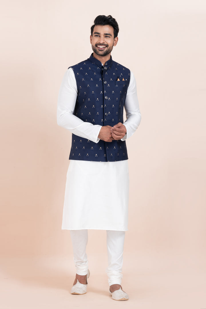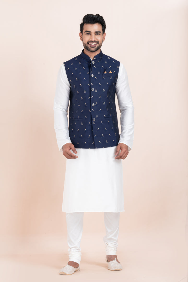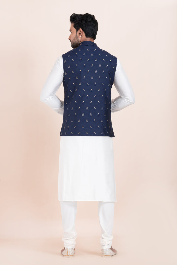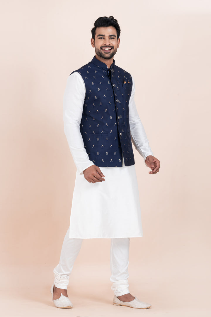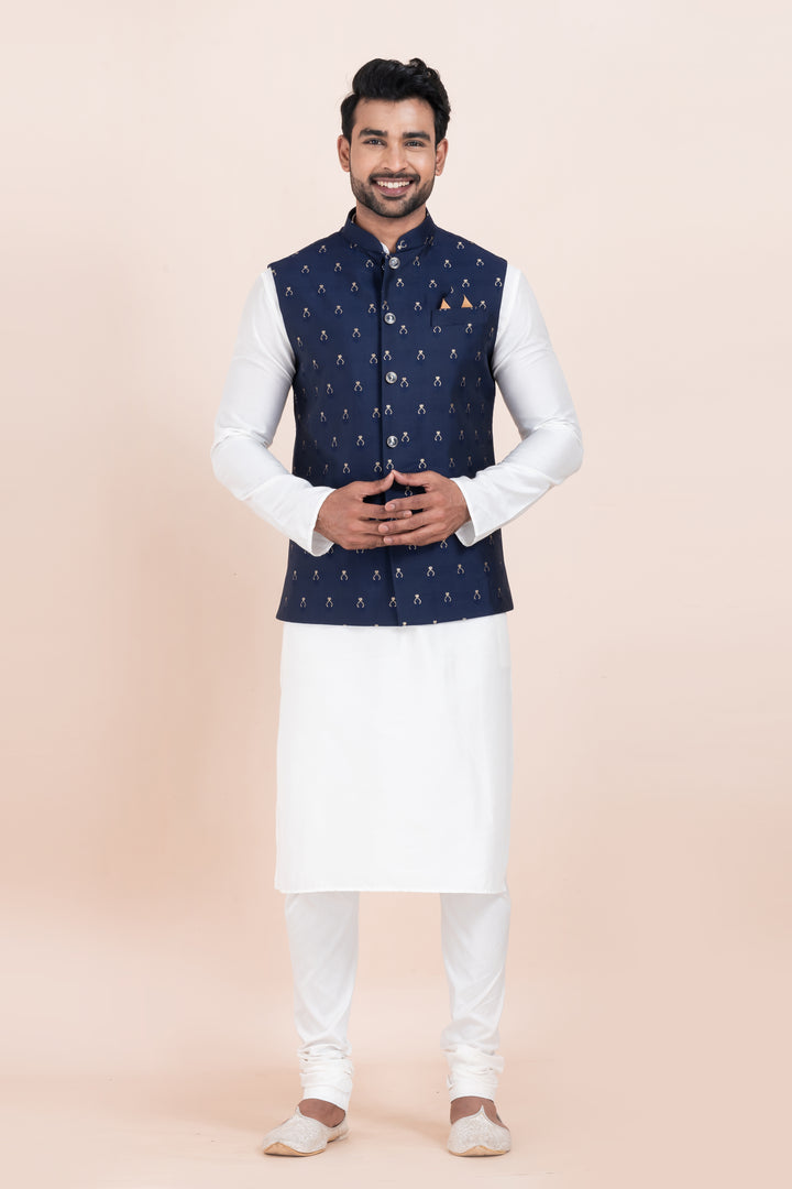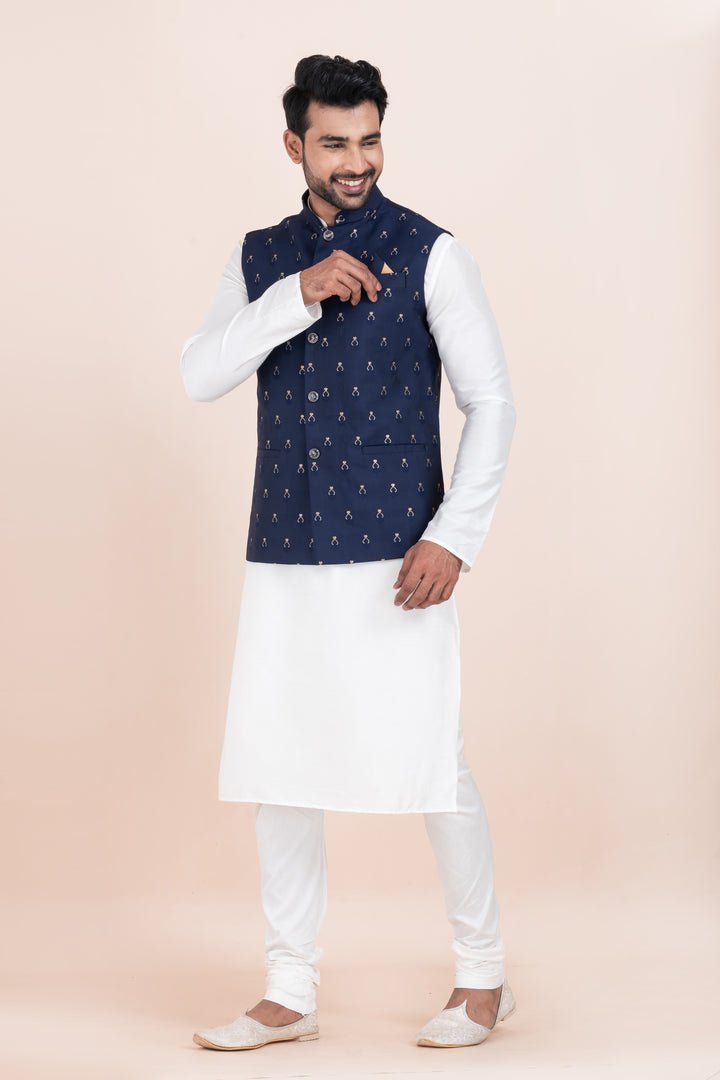 Angasudha Men’s Traditional White Kurta Pyjama with Navy Blue Printed Nehru Jacket