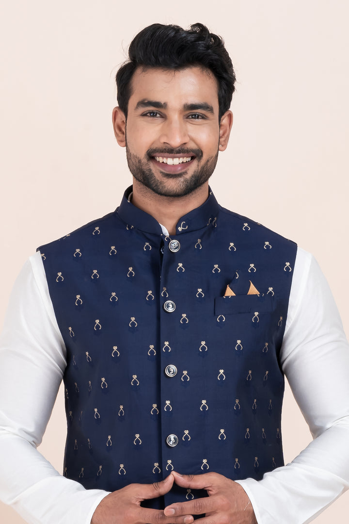 Nehru Jacket: The highlight of this outfit is the navy blue Nehru jacket adorned with subtle golden embroidered motifs. Designed with a mandarin collar and front button closure, it adds a regal touch to the attire. A stylish pocket square enhances the formal appeal.