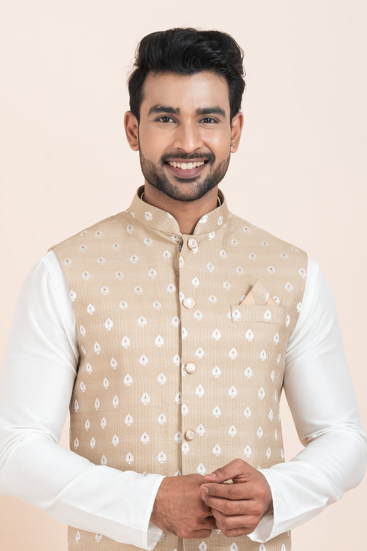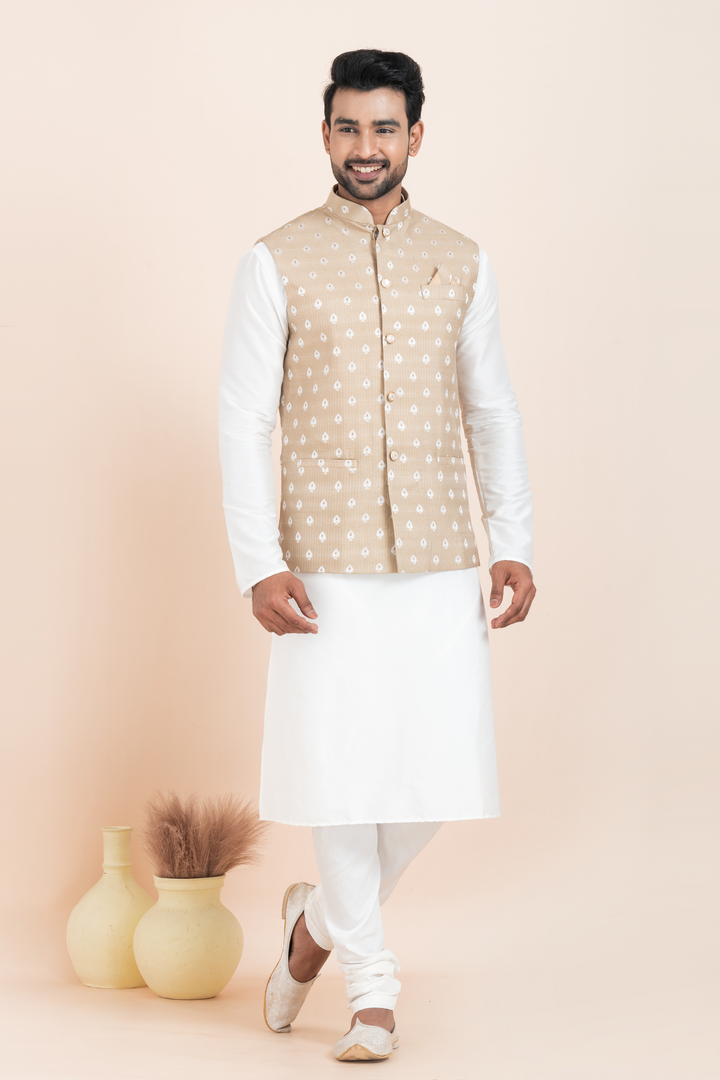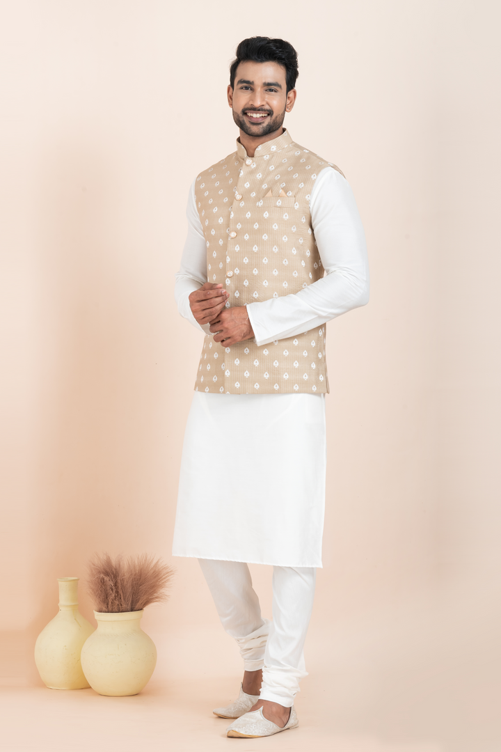 Nehru Jacket: The beige Nehru jacket is adorned with a delicate white Ikat-inspired pattern, giving it a refined ethnic touch. Designed with a mandarin collar, fabric buttons, and a complementing pocket square, it strikes the right balance between minimalism and tradition.