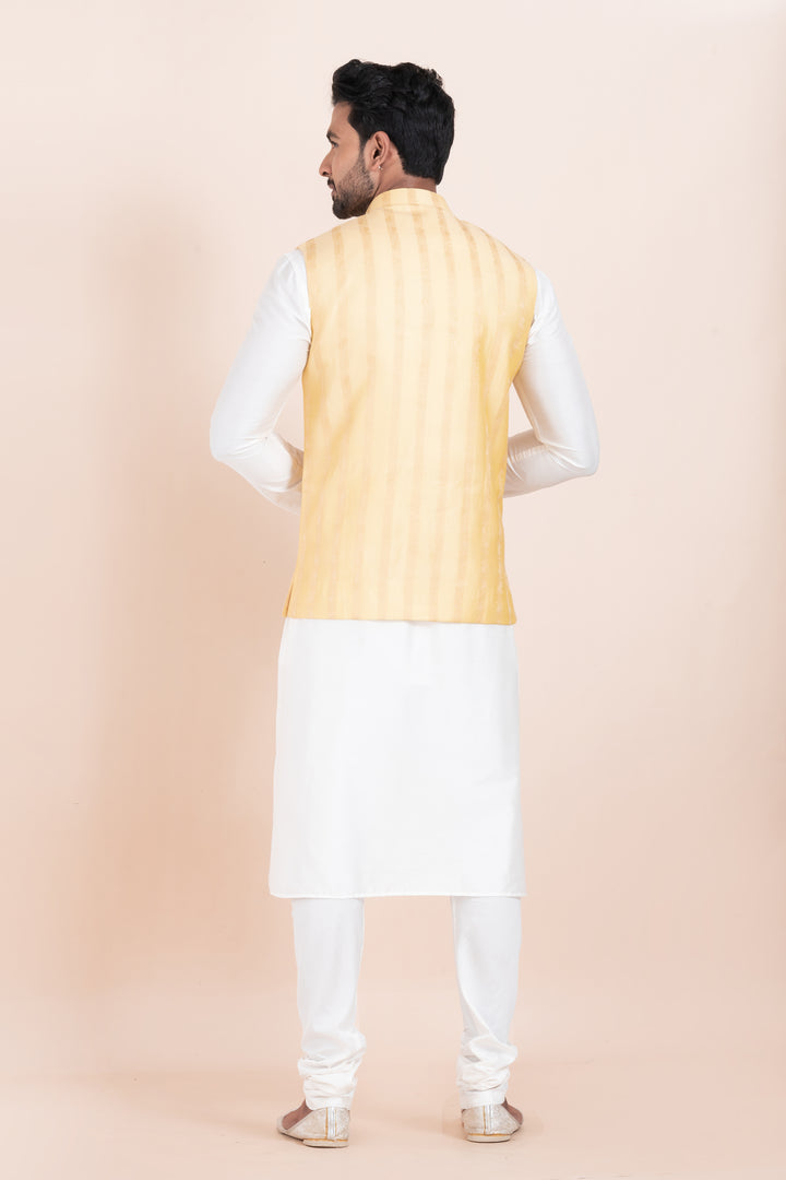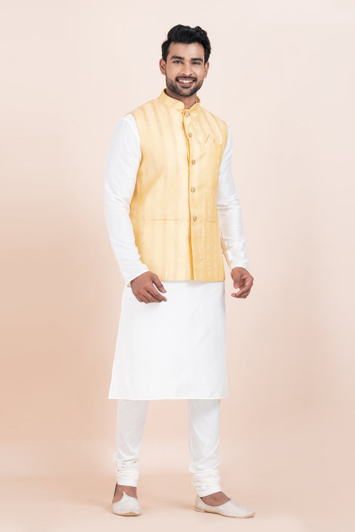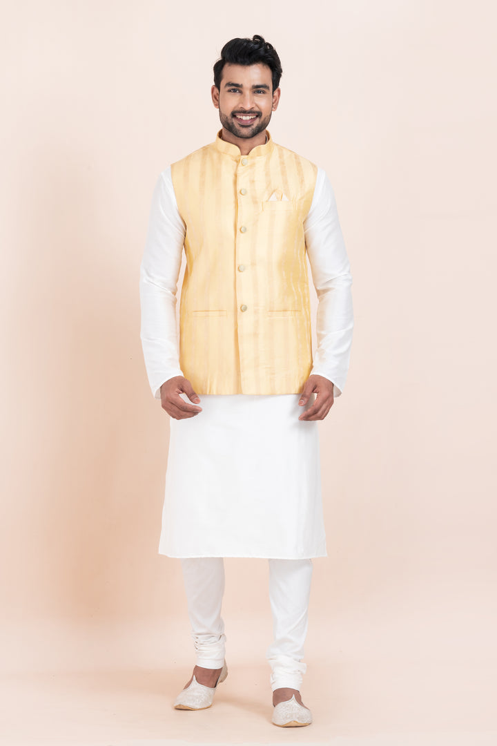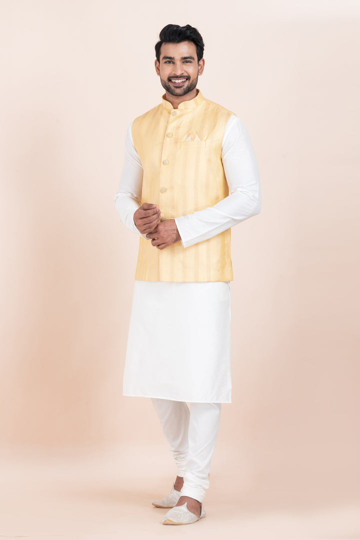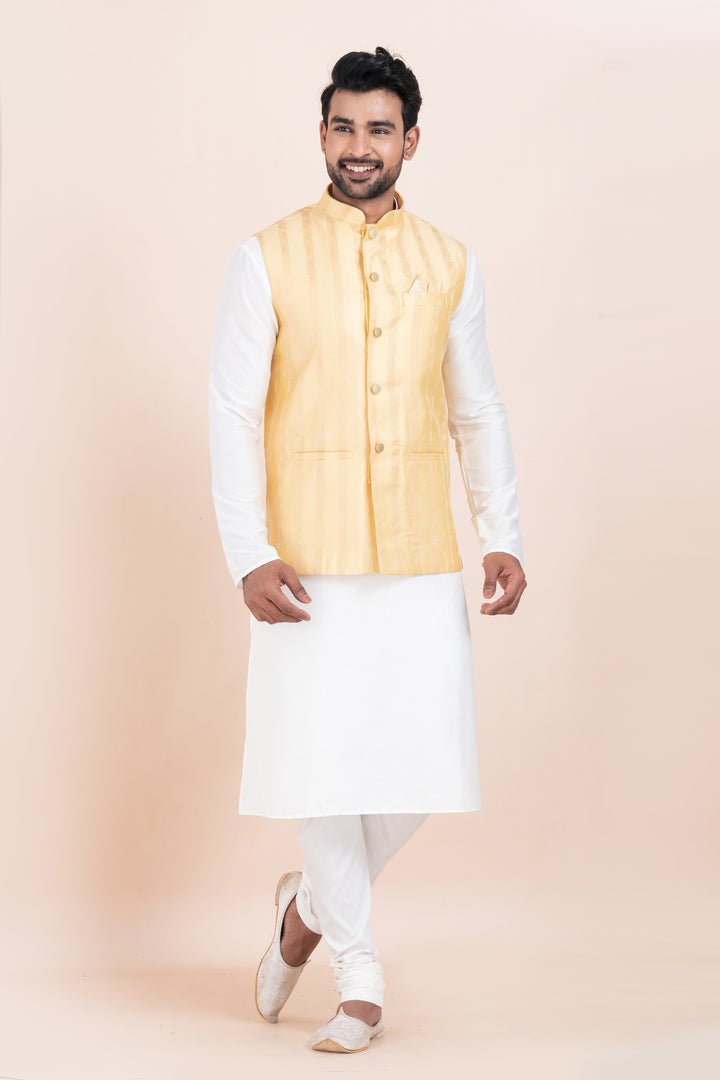 Angasudha Men’s White Kurta Pyjama with Golden Yellow Silk Nehru Jacket