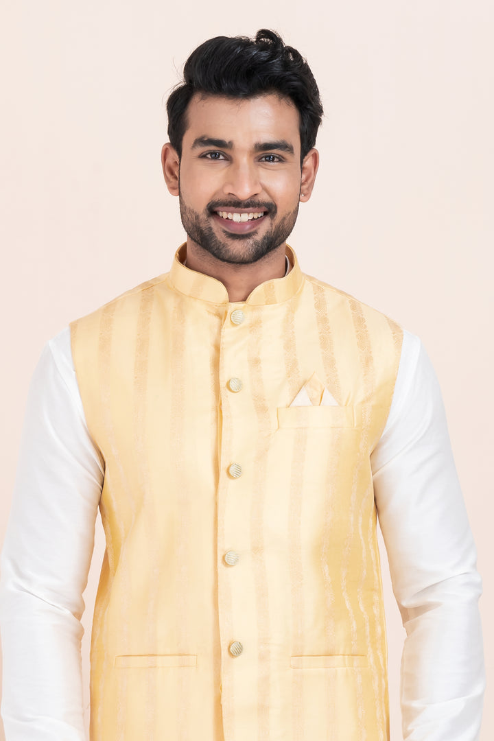 Nehru Jacket: The golden yellow Nehru jacket, crafted from lustrous silk fabric, brings a festive flair with its subtle vertical stripes and sleek finish. The mandarin collar and front button closure maintain a traditional edge, while the pocket square detail adds a touch of elegance.