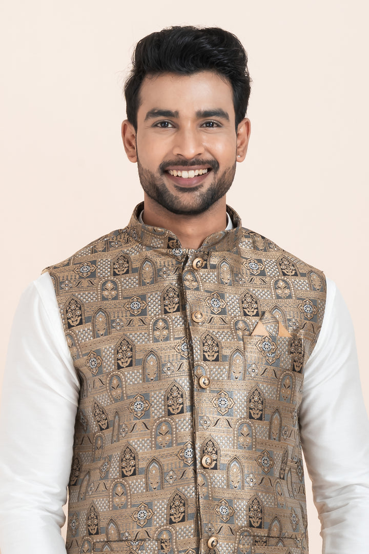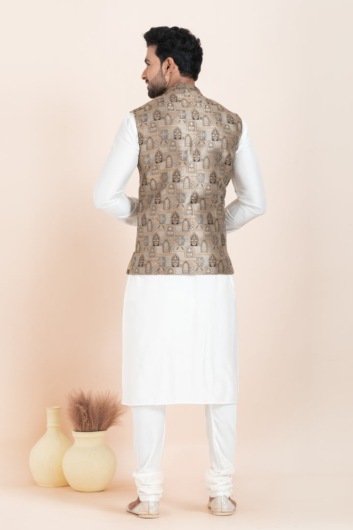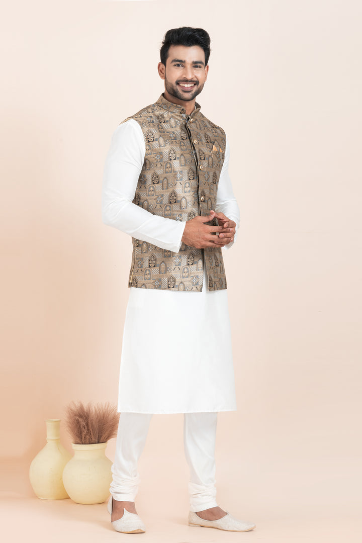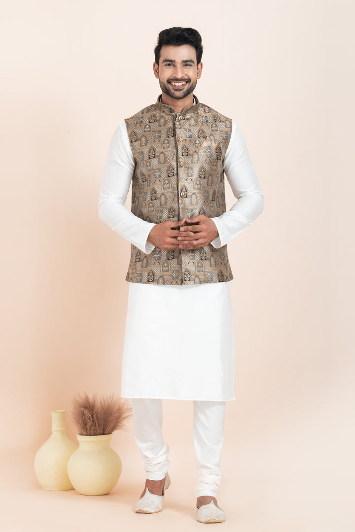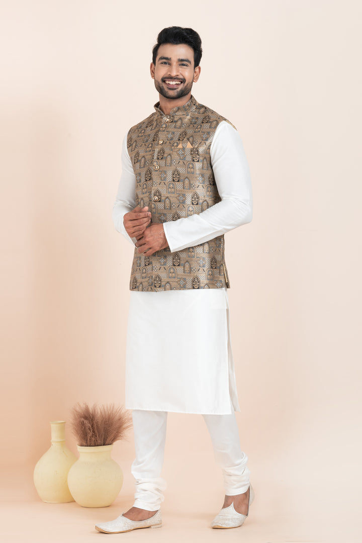 Set Includes: White Kurta Pyjama and Antique Gold Printed Nehru Jacket