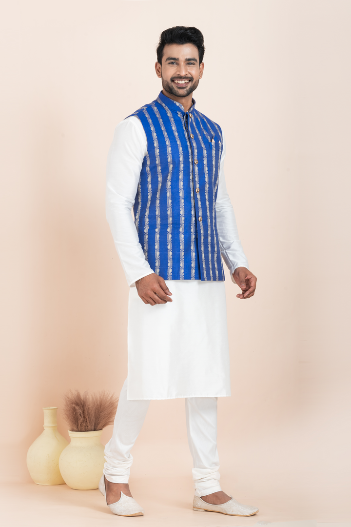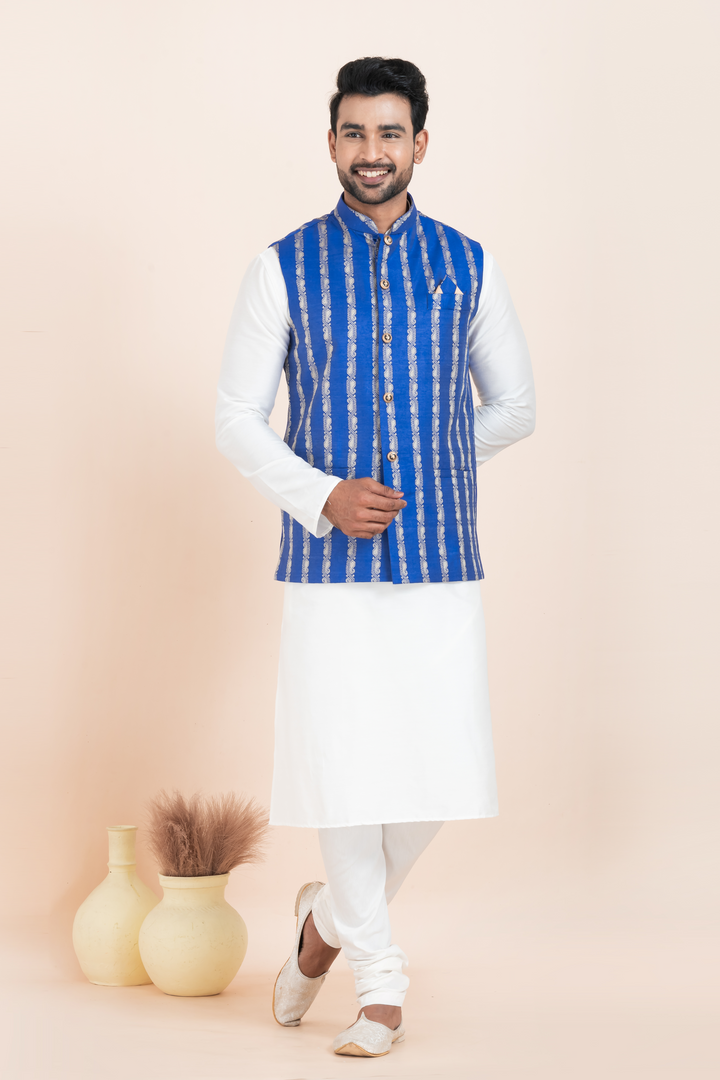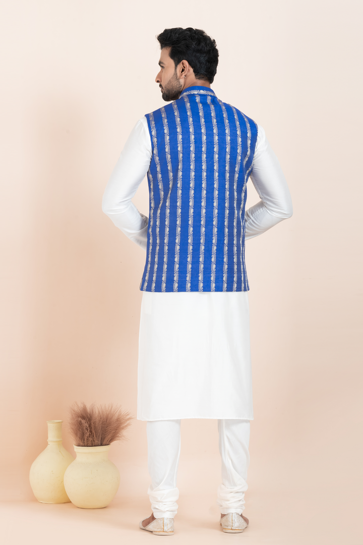 The set features a classic white kurta pyjama made from a soft cotton-silk blend, ensuring breathable comfort and a subtle luster. It is paired with a striking royal blue Nehru jacket crafted from a luxurious cotton-silk blend, detailed with vertical gold-toned ethnic patterns that add richness and regal appeal. The jacket is completed with a mandarin collar, gold buttons, and a sleek pocket square for added finesse.