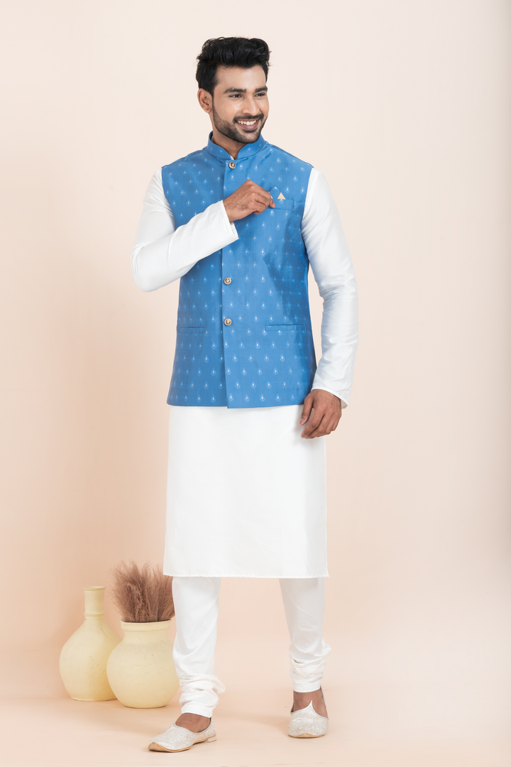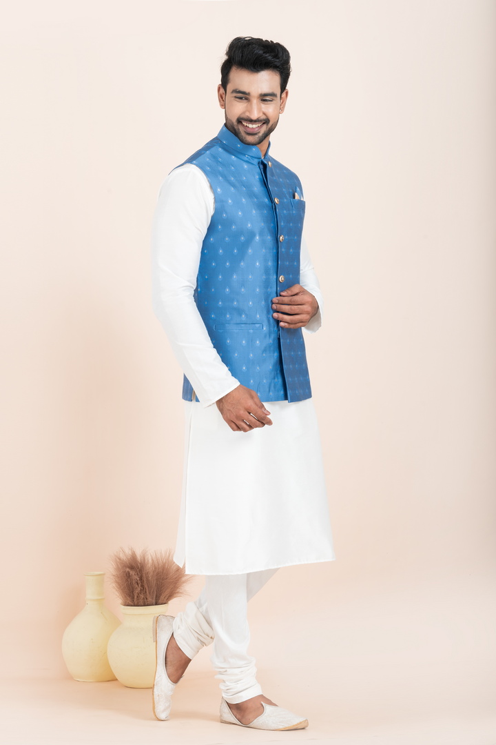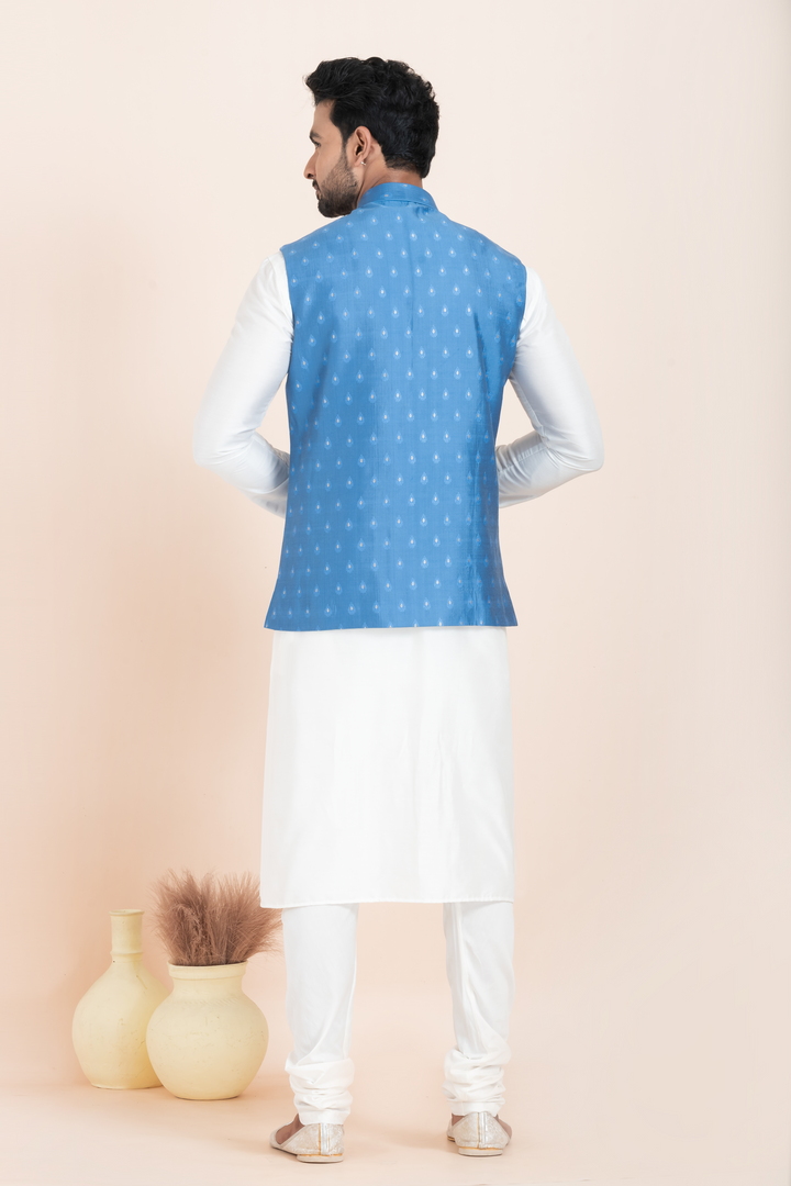Set Includes: White Kurta Pyjama and Sky Blue Printed Nehru Jacket