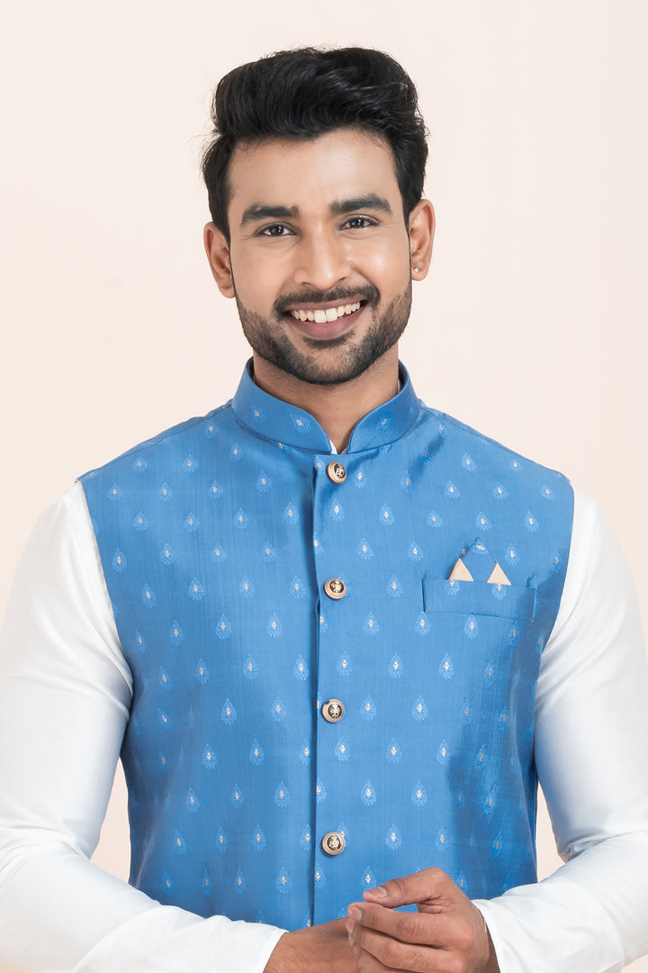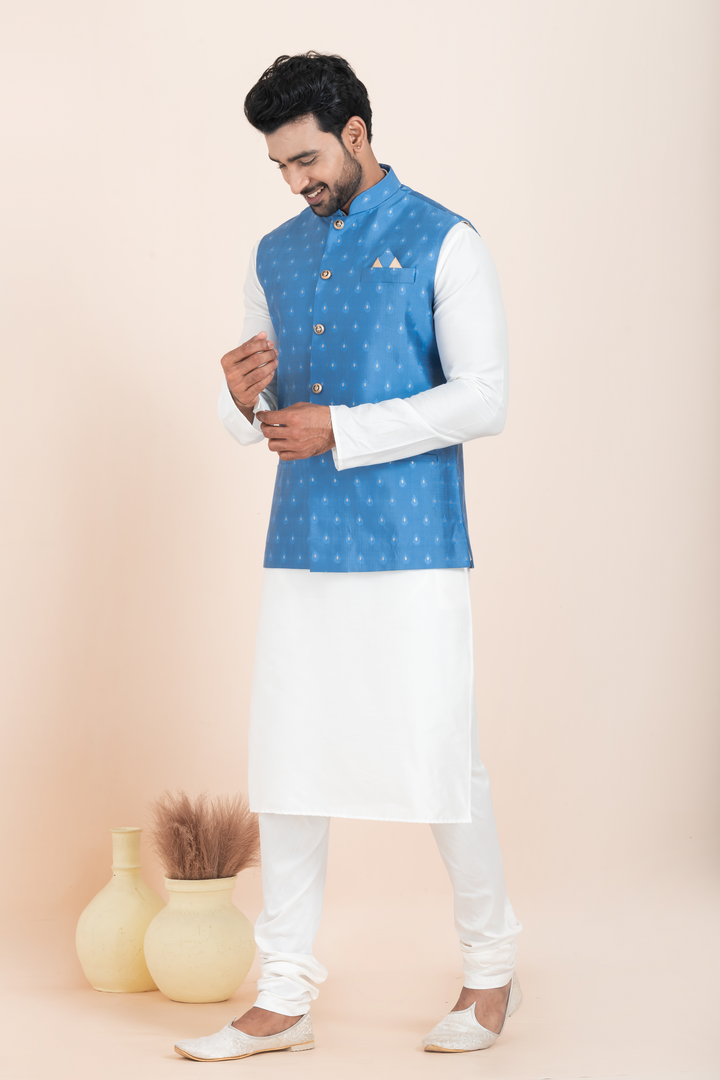 The crisp white kurta pyjama is crafted from a rich cotton-silk blend, offering unmatched comfort with a gentle sheen. Paired with a sky blue Nehru jacket made from a premium cotton-silk blend, it features subtle ethnic motifs, a sharp mandarin collar, golden buttons, and a stylish pocket square that adds a contemporary edge.