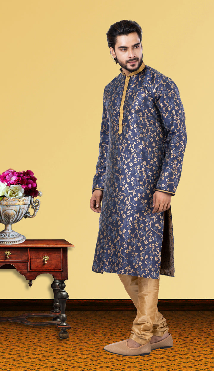 Command attention in this striking Midnight Blue Jacquard kurta, adorned with intricate floral zari motifs and paired with a rich Golden Dupion Silk pyjama. The contrast detailing on the collar and placket adds a touch of regal finesse, making it an exquisite choice for grand celebrations and cultural festivities.