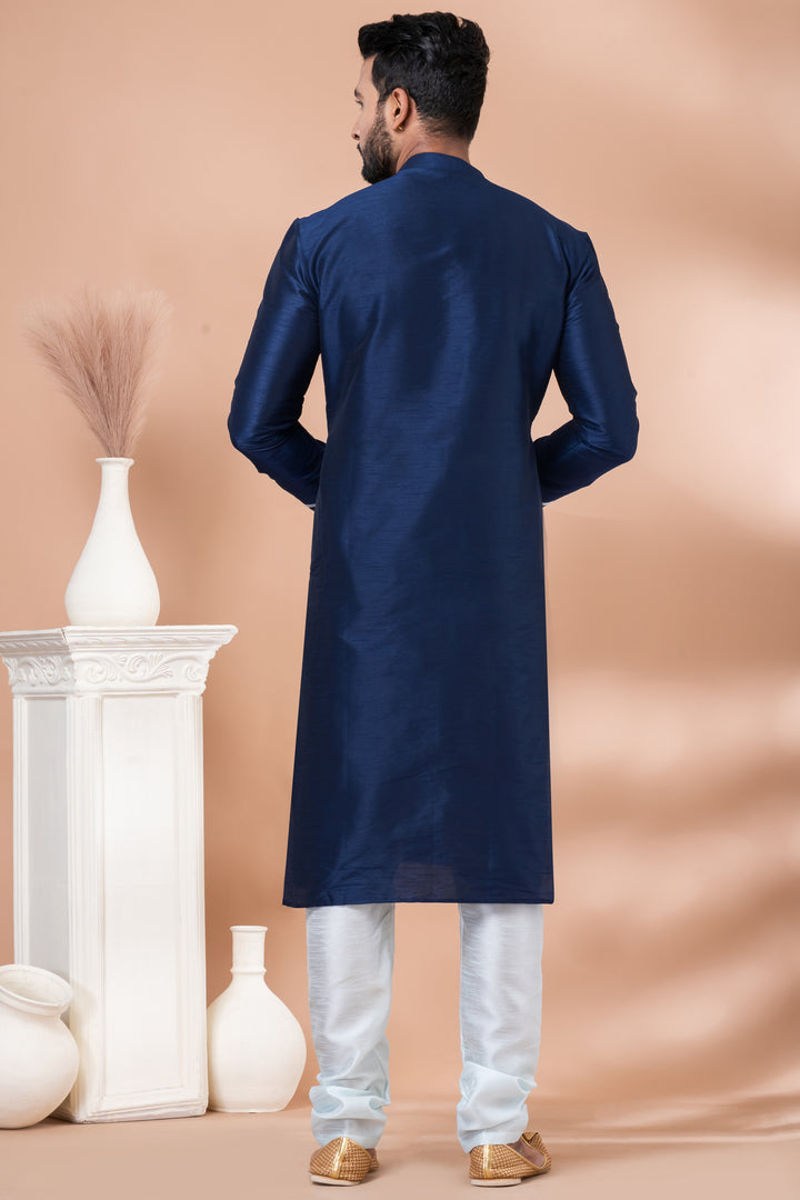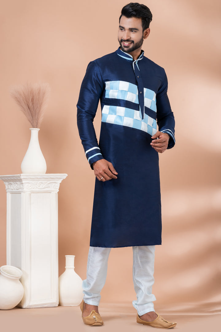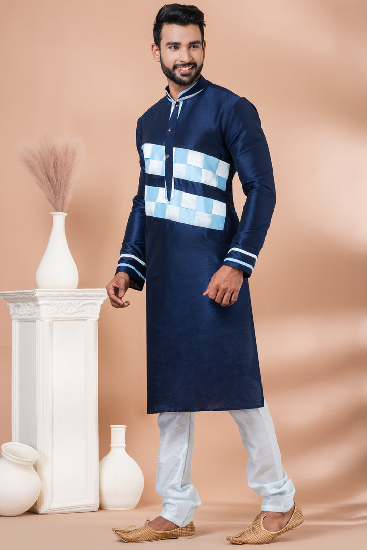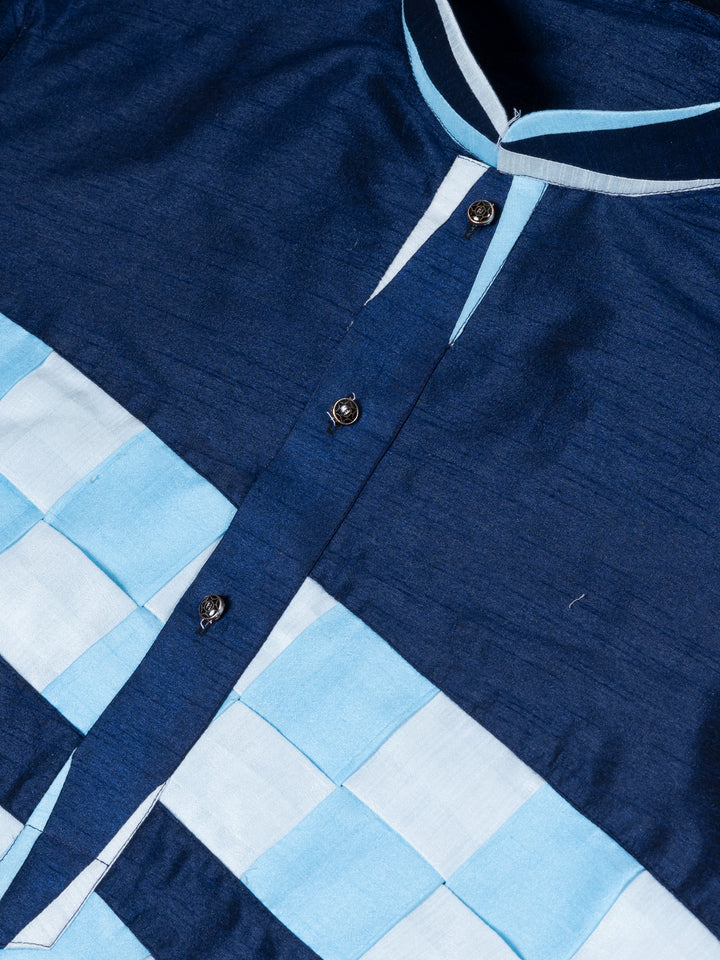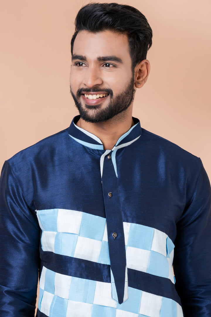 Angasudha Midnight Blue Dupion Silk Kurta with Sky Blue Checkered Panel & Light Pyjama