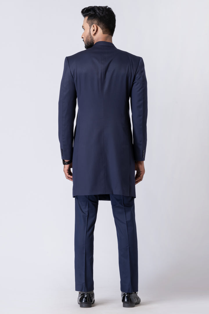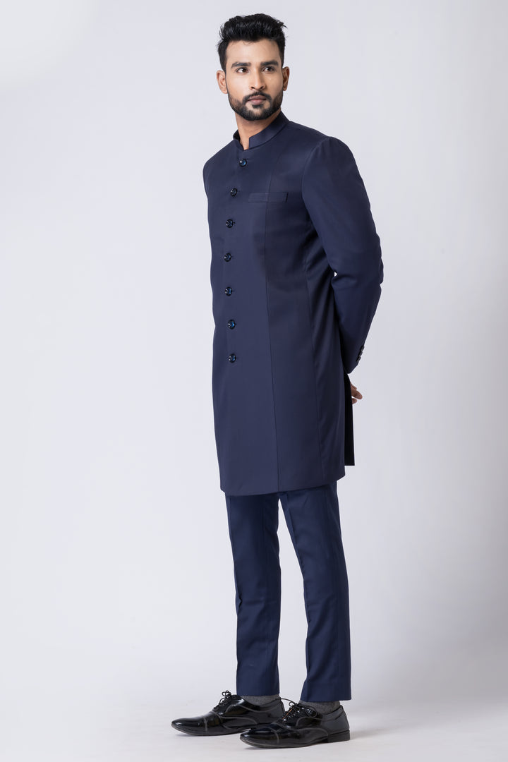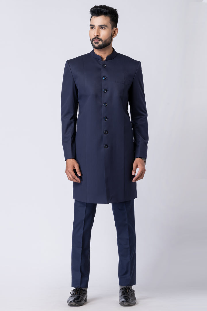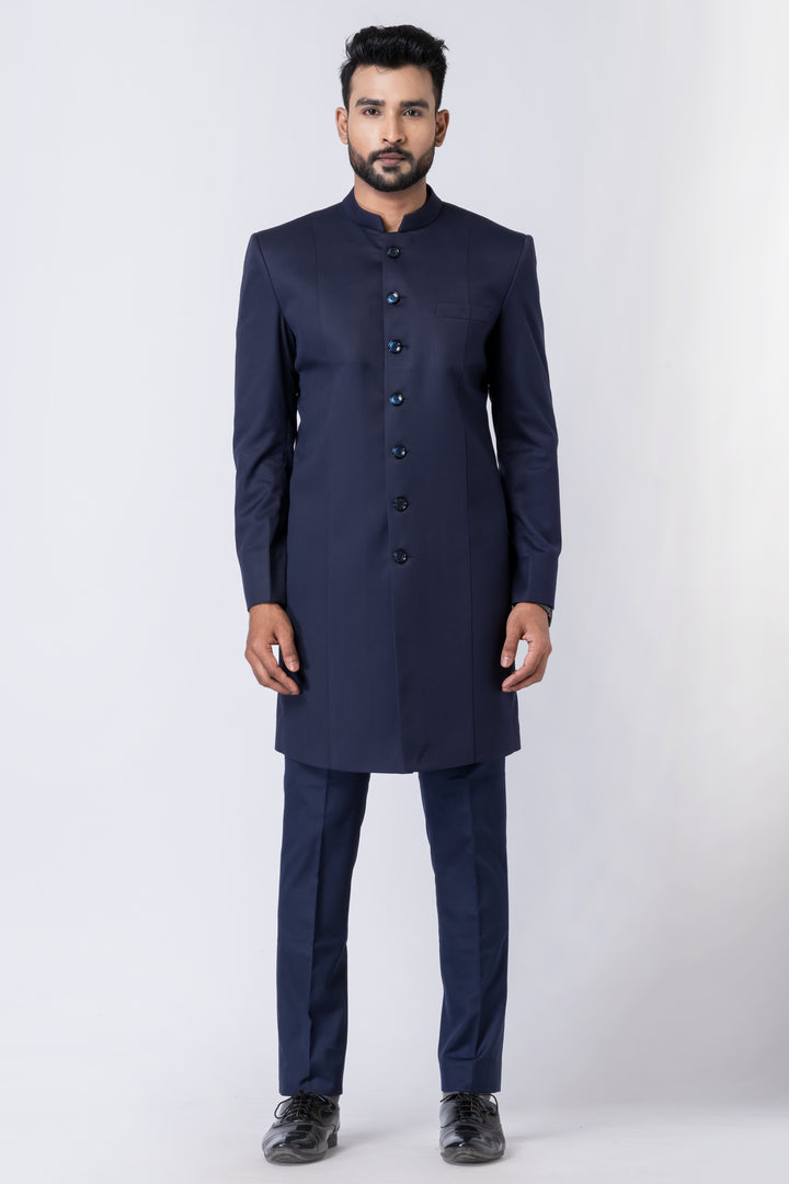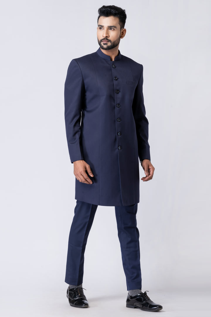 Step into timeless elegance with this Midnight Blue Long Jodhpuri Suit, a sophisticated ensemble crafted for refined occasions. Featuring a sleek mandarin collar, extended jacket length, and classic front button placket, this suit effortlessly merges Indian tradition with Western tailoring.