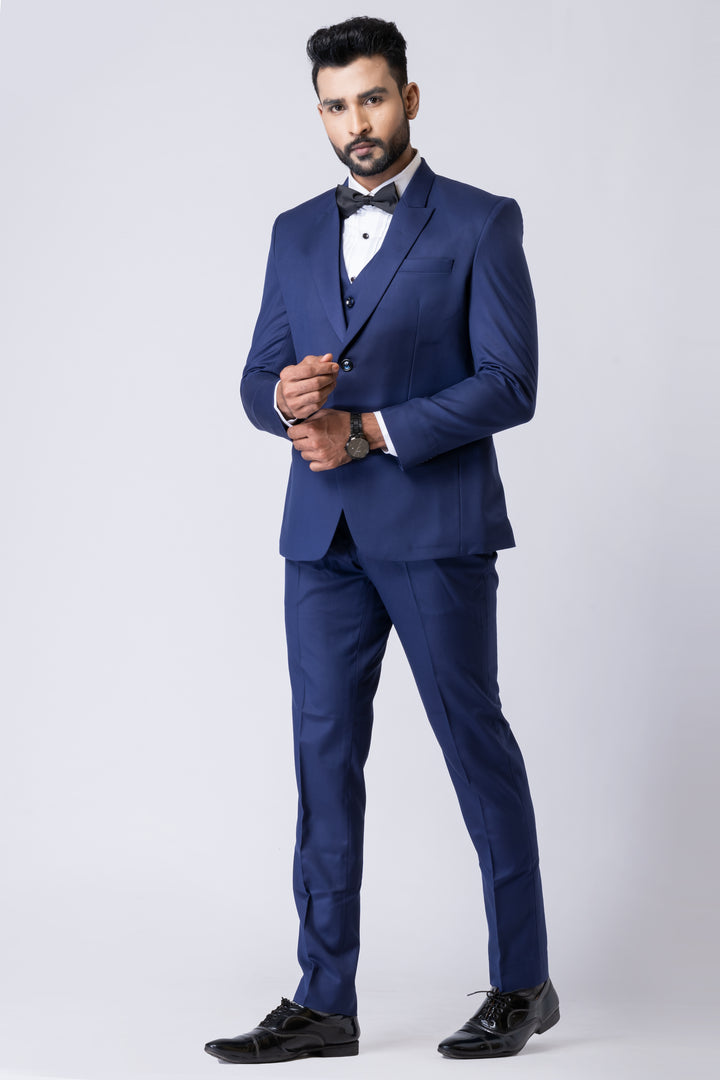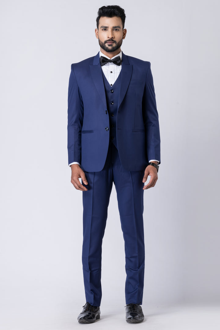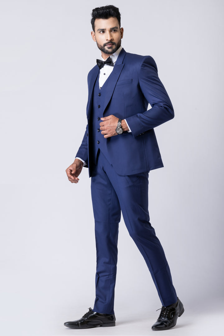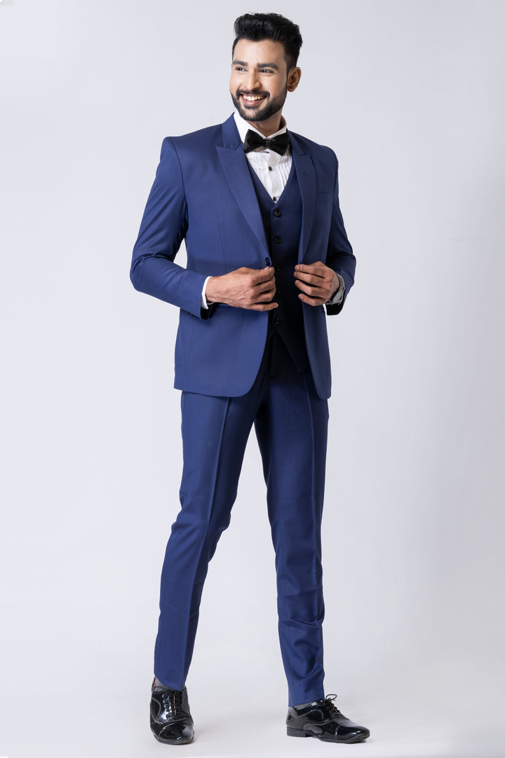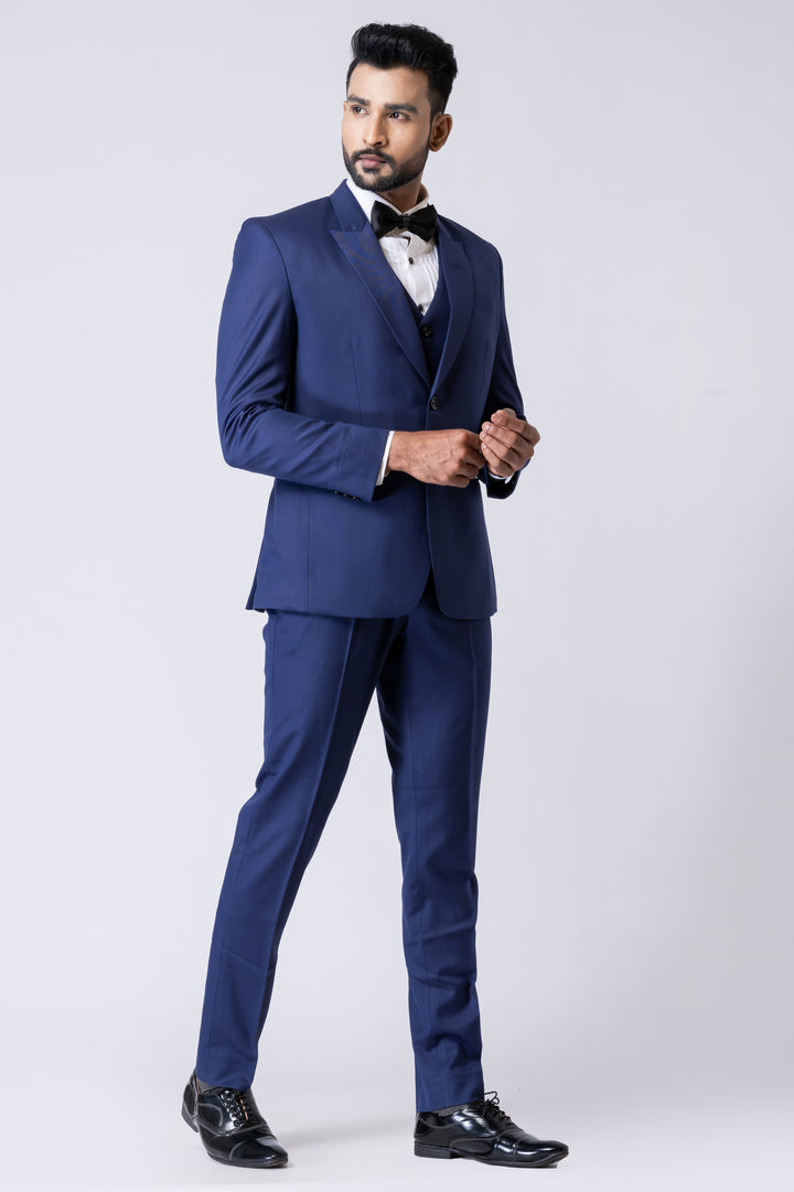 The deep navy tone, paired with a crisp white shirt and classic bow tie (as styled), makes it ideal for evening occasions and black-tie events.