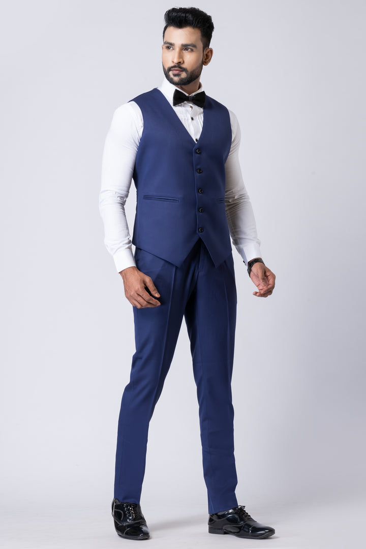 Step into elegance with the Angasudha Midnight Blue Tuxedo Suit Set – the perfect ensemble for modern celebrations and elite gatherings. Tailored to perfection in Polystar Mix fabric, this 3-piece tuxedo features a sleek blazer, a matching waistcoat, and well-fitted trousers that together create a bold and dignified silhouette.
