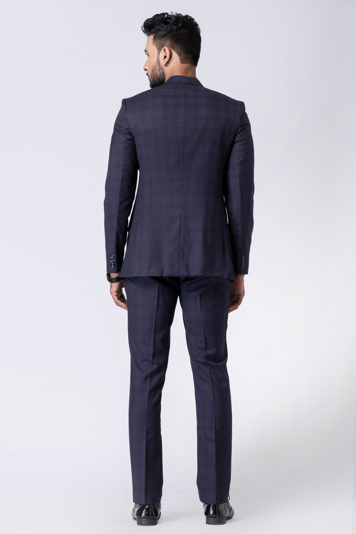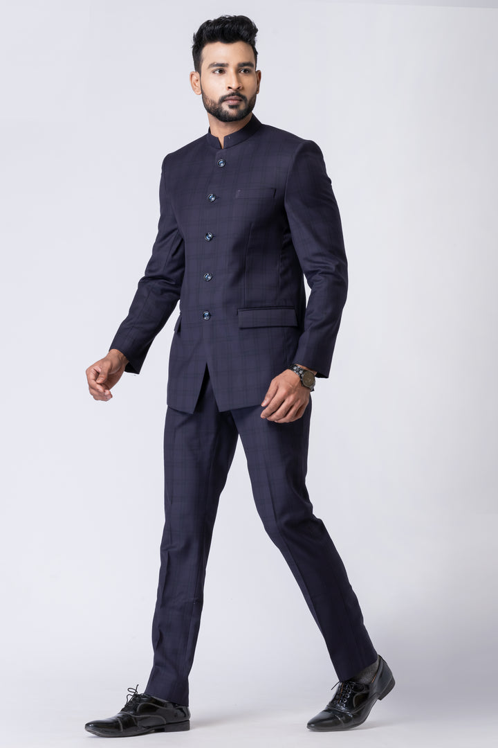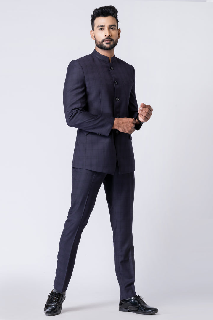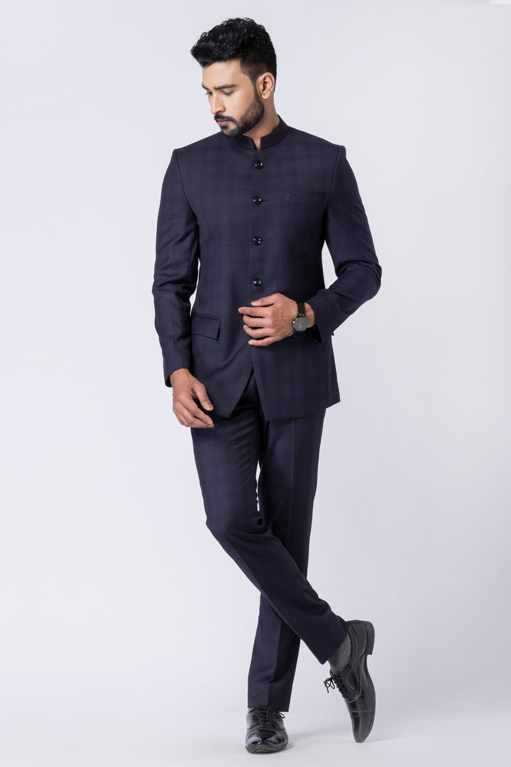 Elevate your style with the refined charm of this Midnight Checked Jodhpuri Suit, where classic design meets contemporary tailoring. The subtle checkered pattern adds depth to the deep navy base, while the structured bandhgala collar and sleek buttons give it a polished, regal edge.
