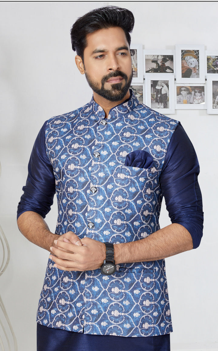 Angasudha Midnight Digital Print Cotton Waistcoat with Dupion Silk Kurta Pyjama Set