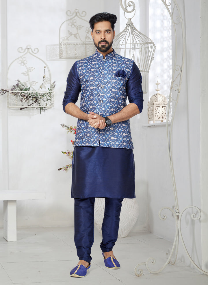 Command attention with timeless elegance in the Angasudha Midnight Ivy ensemble. The intricately embroidered waistcoat showcases a regal vine motif in ivory thread over a shimmering royal blue base. Paired with a perfectly matched Dupion Silk kurta and churidar in the same rich navy tone, this set is sophistication personified.