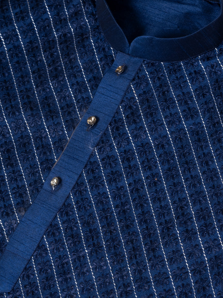 Unleash your regal charm with the Angasudha Midnight Majesty Kurta Pyjama Set, a bold and elegant choice for the modern man. The deep navy blue kurta is crafted from luxurious blended silk, adorned with intricate geometric thread embroidery in a contrasting white tone. The angular linear patterns bring an architectural finesse to this classic silhouette, while the band collar and buttoned placket add a timeless appeal.