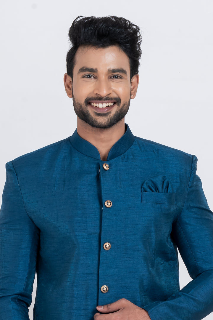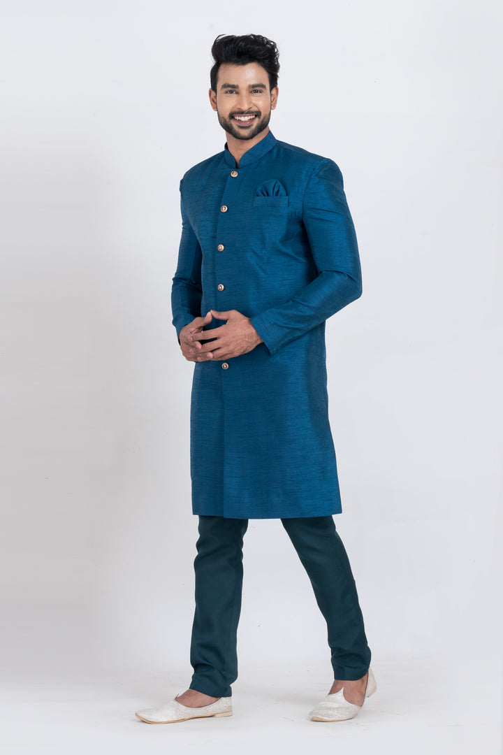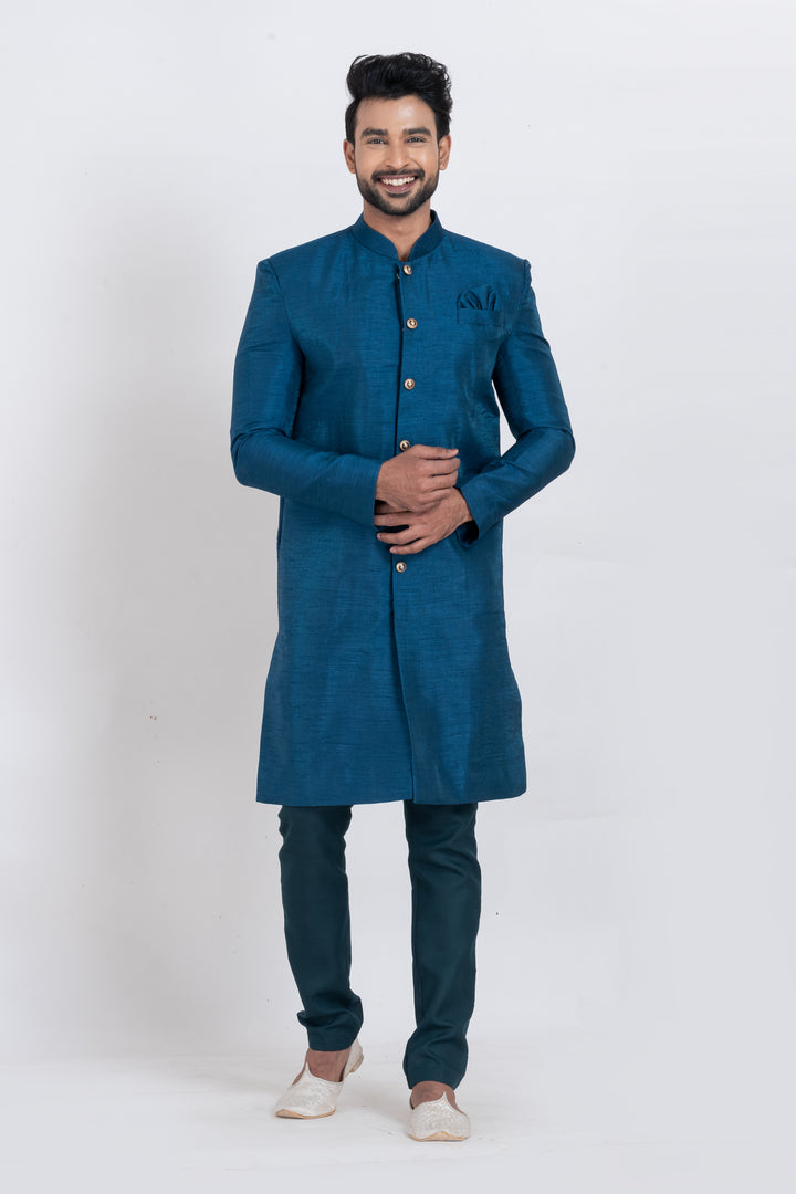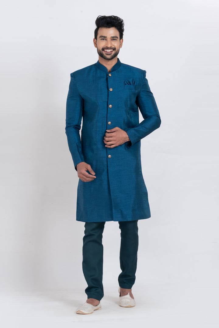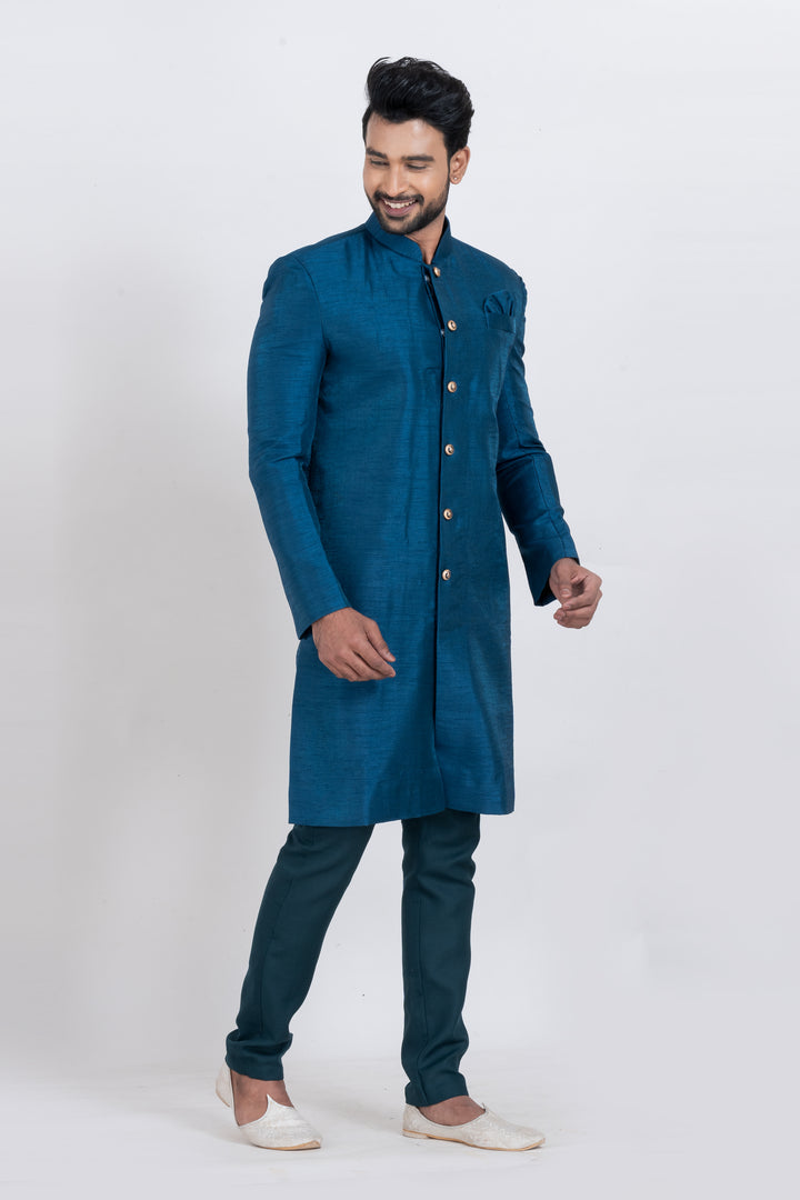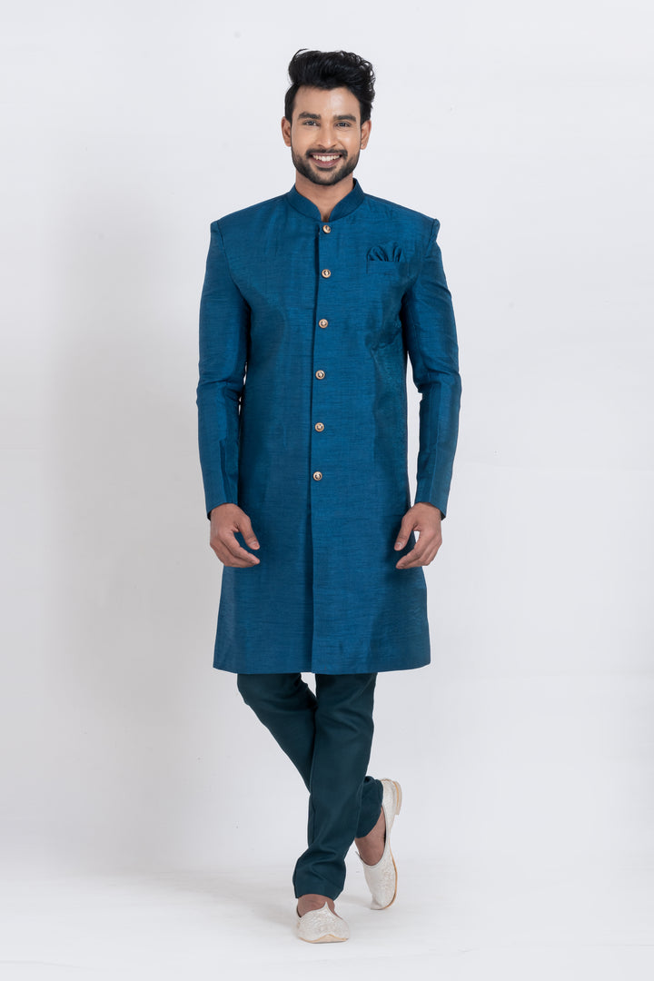 Design Highlights: Bandhgala Collar, Wooden Button Detailing, Pocket Square Accent, Solid Finish