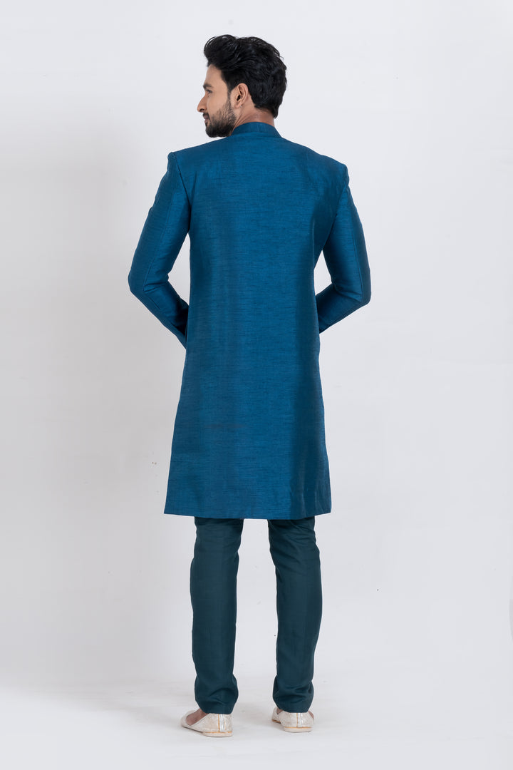 Make a bold and refined statement with the Midnight Majesty Indo Western Set, tailored for the gentleman who values elegance with an edge. Designed in a rich deep blue shade, this ensemble features a clean, structured silhouette made from lustrous art silk. The wooden buttons and subtle pocket square detailing offer a contemporary royal vibe, ideal for evening festivities.