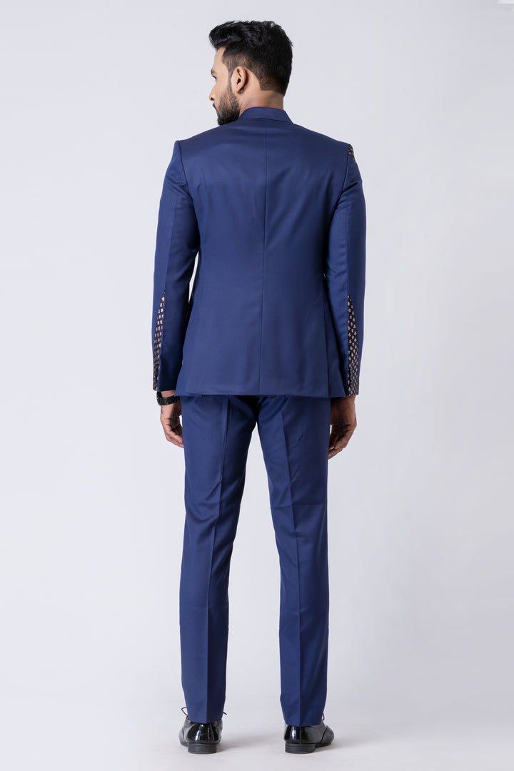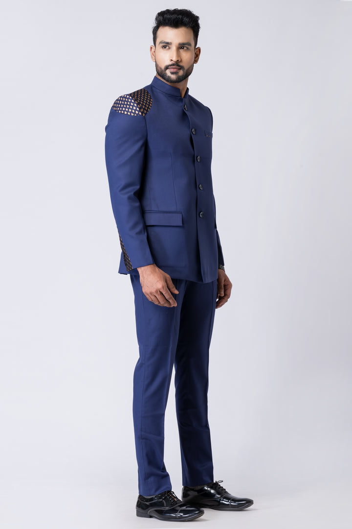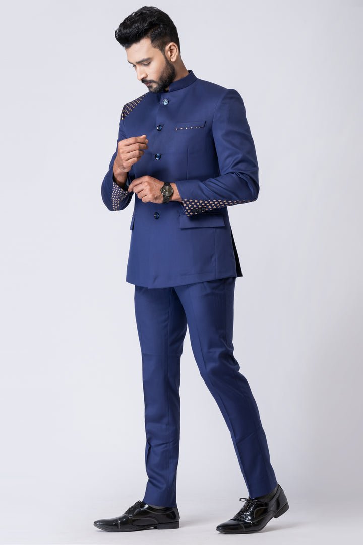 Unleash your inner royalty with the Midnight Regal Jodhpuri Suit — a masterstroke of elegance and bold styling. Designed in a deep navy blue shade, this suit features a commanding silhouette enhanced by a sharp Mandarin collar and statement buttons. The highlight? A uniquely embellished shoulder and coordinated pocket square that add a dash of contemporary charm to this royal classic.